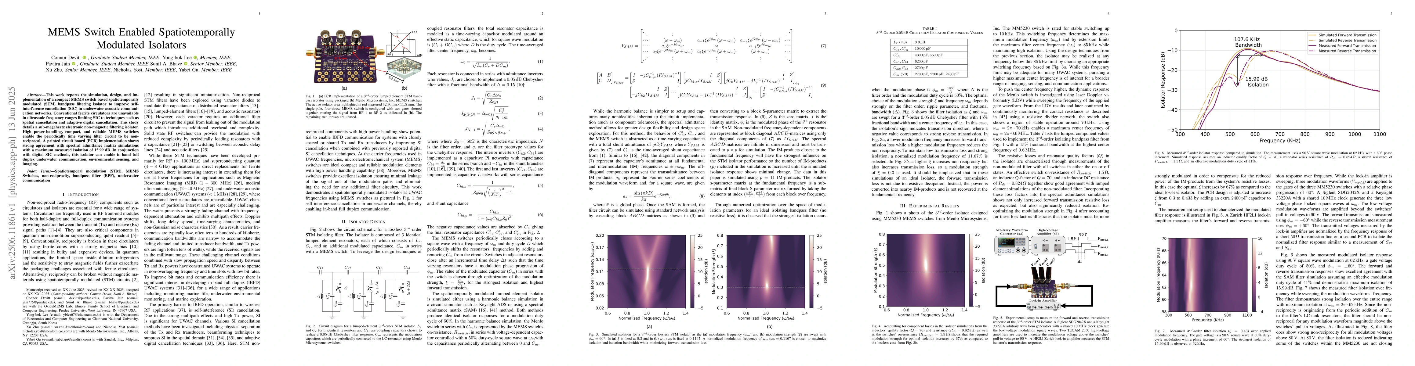 This work reports the simulation, design, and implementation of a compact MEMS switch based spatiotemporally modulated (STM) bandpass filtering isolator to improve self-interference cancellation (SIC) in underwater acoustic communication networks. Conventional ferrite circulators are unavailable in ultrasonic frequency ranges limiting SIC to techniques such as spatial cancellation and adaptive digital cancellation. This study details a sub-megahertz electronic non-magnetic filtering isolator. High power-handling, compact, and reliable MEMS switches enable the periodically time varying filter circuit to be non-reciprocal. A printed circuit board (PCB) implementation shows strong agreement with spectral admittance matrix simulations with a maximum measured isolation of 15.99 dB. In conjunction with digital SIC methods, this isolator can enable in-band full duplex underwater communication, environmental sensing, and imaging.