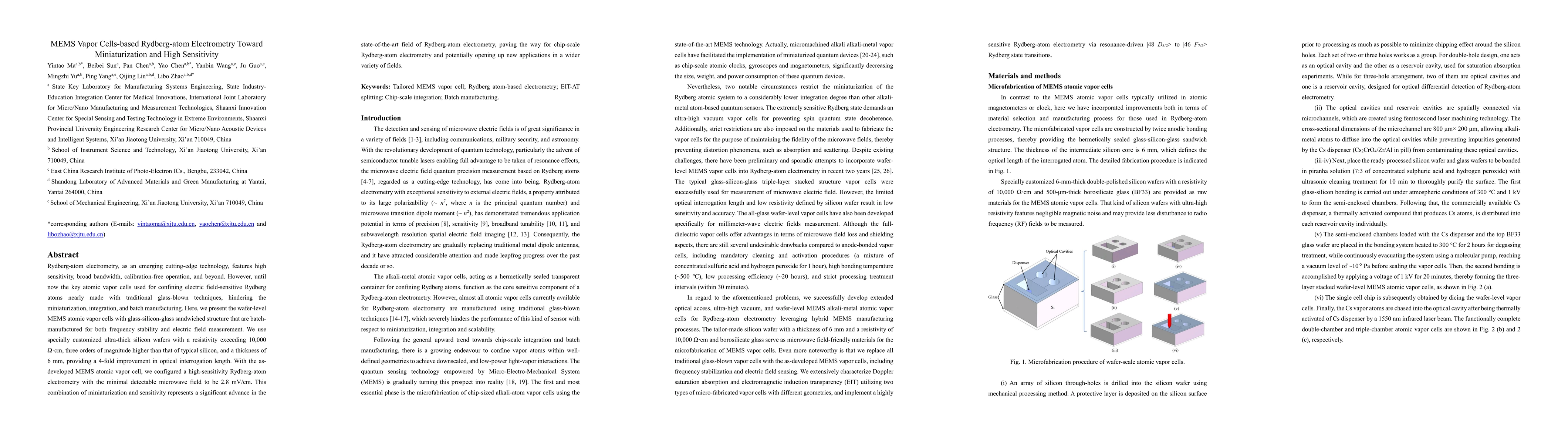 Rydberg-atom electrometry, as an emerging cutting-edge technology, features high sensitivity, broad bandwidth, calibration-free operation, and beyond. However, until now the key atomic vapor cells used for confining electric field-sensitive Rydberg atoms nearly made with traditional glass-blown techniques, hindering the miniaturization, integration, and batch manufacturing. Here, we present the wafer-level MEMS atomic vapor cells with glass-silicon-glass sandwiched structure that are batch-manufactured for both frequency stability and electric field measurement. We use specially customized ultra-thick silicon wafers with a resistivity exceeding 10,000 cm, three orders of magnitude higher than that of typical silicon, and a thickness of 6 mm, providing a 4-fold improvement in optical interrogation length. With the as-developed MEMS atomic vapor cell, we configured a high-sensitivity Rydberg-atom electrometry with the minimal detectable microwave field to be 2.8 mV/cm. This combination of miniaturization and sensitivity represents a significant advance in the state-of-the-art field of Rydberg-atom electrometry, paving the way for chip-scale Rydberg-atom electrometry and potentially opening up new applications in a wider variety of fields.