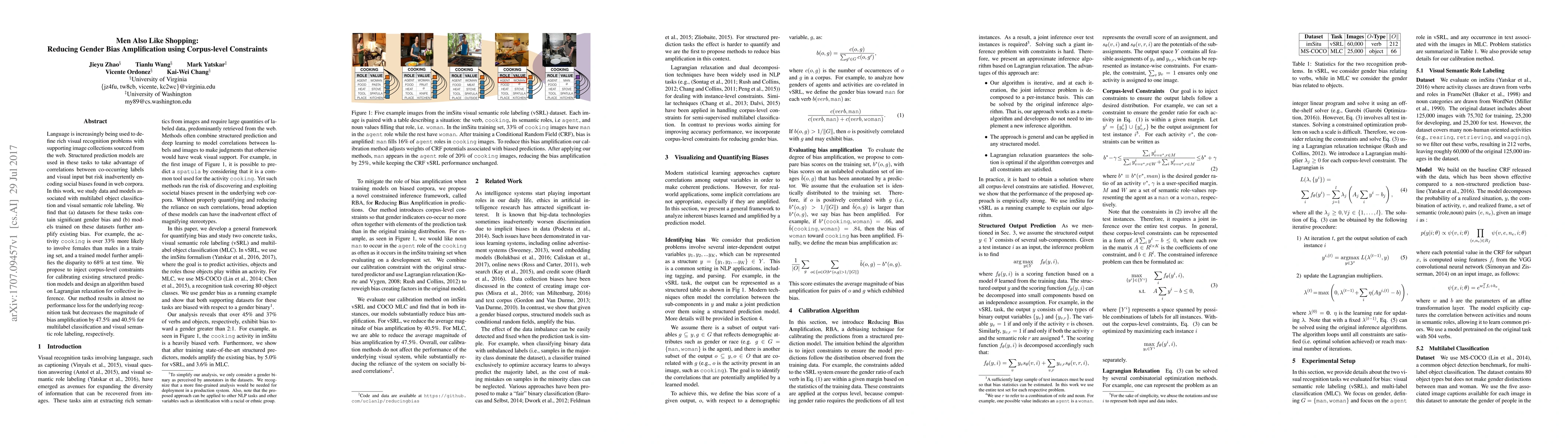 Language is increasingly being used to define rich visual recognition problems with supporting image collections sourced from the web. Structured prediction models are used in these tasks to take advantage of correlations between co-occurring labels and visual input but risk inadvertently encoding social biases found in web corpora. In this work, we study data and models associated with multilabel object classification and visual semantic role labeling. We find that (a) datasets for these tasks contain significant gender bias and (b) models trained on these datasets further amplify existing bias. For example, the activity cooking is over 33% more likely to involve females than males in a training set, and a trained model further amplifies the disparity to 68% at test time. We propose to inject corpus-level constraints for calibrating existing structured prediction models and design an algorithm based on Lagrangian relaxation for collective inference. Our method results in almost no performance loss for the underlying recognition task but decreases the magnitude of bias amplification by 47.5% and 40.5% for multilabel classification and visual semantic role labeling, respectively.