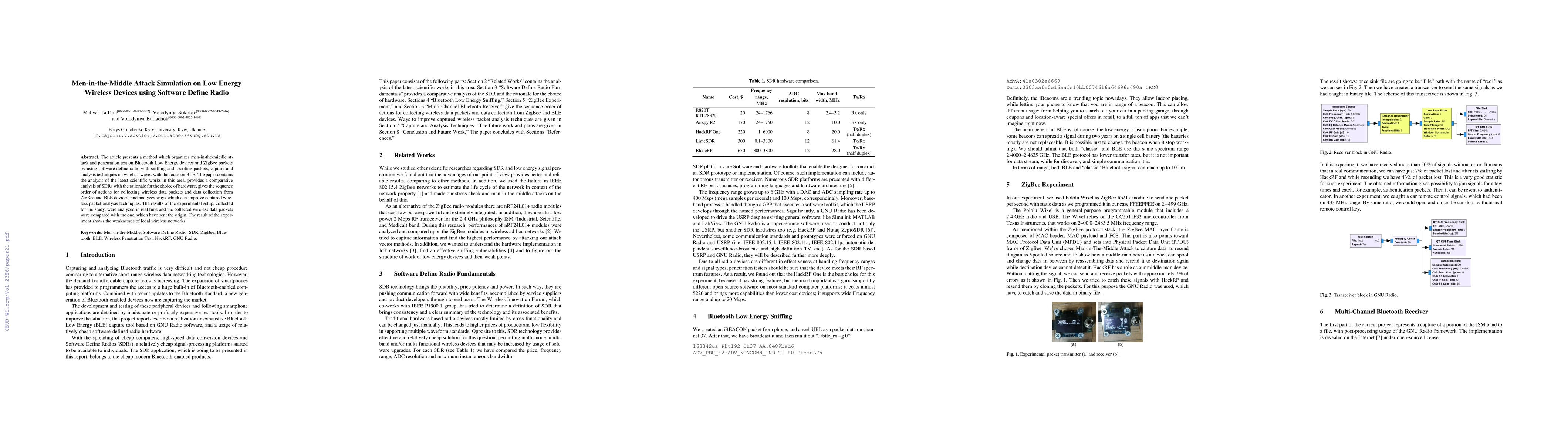 The article presents a method of organizing men-in-the-middle attack and penetration test on Bluetooth Low Energy devices and ZigBee packets using software define radio with sniffing and spoofing packets, capture and analysis techniques on wireless waves with the focus on Bluetooth. The paper contains the analysis of the latest scientific work in this area, provides a comparative analysis of SDRs and the rationale for the choice of hardware, gives the sequence of actions for collecting wireless data packets and data collection from ZigBee and BLE devices, and analyzes ways to improve captured wireless packet analysis techniques. For the study collected experimental setup, the results of which are analyzed in real time. The collected wireless data packets are compared with those sent. The result of the experiment shows the weaknesses of local wireless networks.