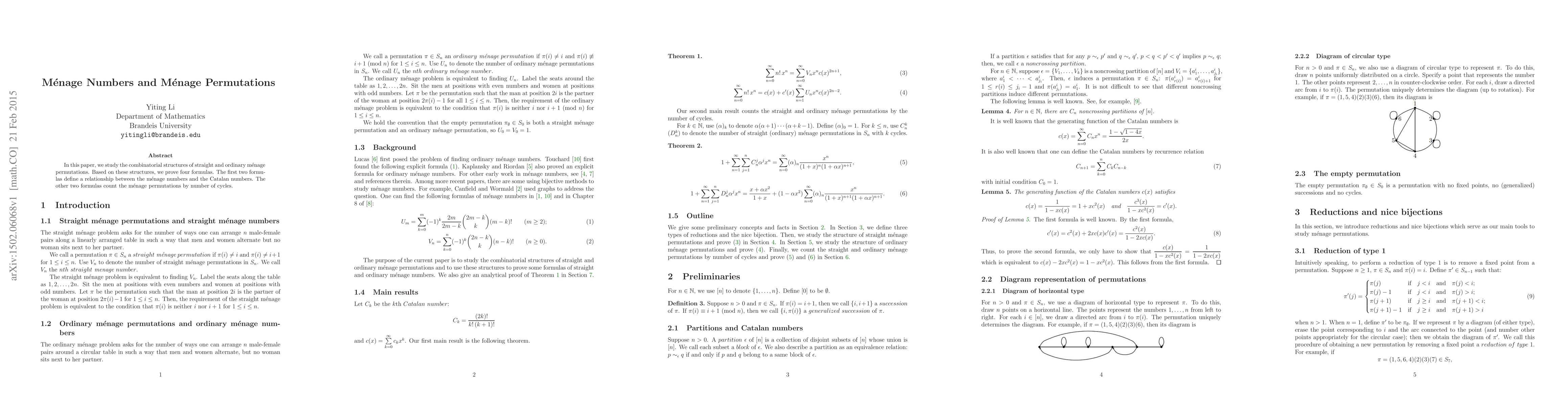 This paper explores the combinatorial properties of straight and ordinary ménage permutations, establishing four formulas that link ménage numbers to Catalan numbers and count ménage permutations by the number of cycles.
