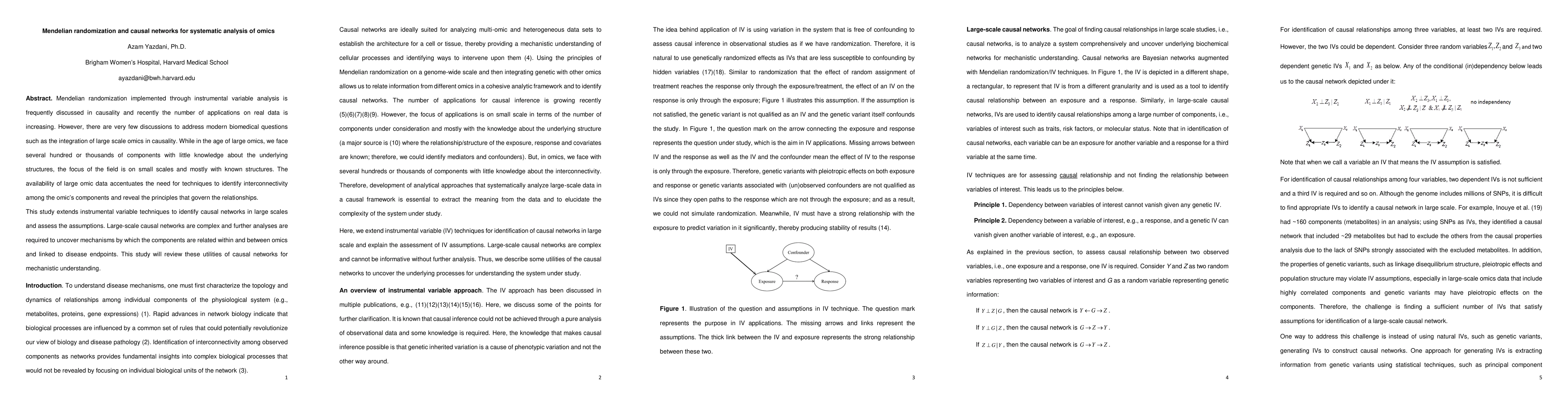 Mendelian randomization implemented through instrumental variable analysis is frequently discussed in causality and recently the number of applications on real data is increasing. However, there are very few discussions to address modern biomedical questions such as the integration of large scale omics in causality. While in the age of large omics, we face several hundred or thousands of components with little knowledge about the underlying structures, the focus of the field is on small scales and mostly with known structures. The availability of large omic data accentuates the need for techniques to identify interconnectivity among the omic components and reveal the principles that govern the relationships. This study extends instrumental variable techniques to identify causal networks in large scales and assess the assumptions. Large-scale causal networks are complex and further analyses are required to uncover mechanisms by which the components are related within and between omics and linked to disease endpoints. This study will review these utilities of causal networks for mechanistic understanding.