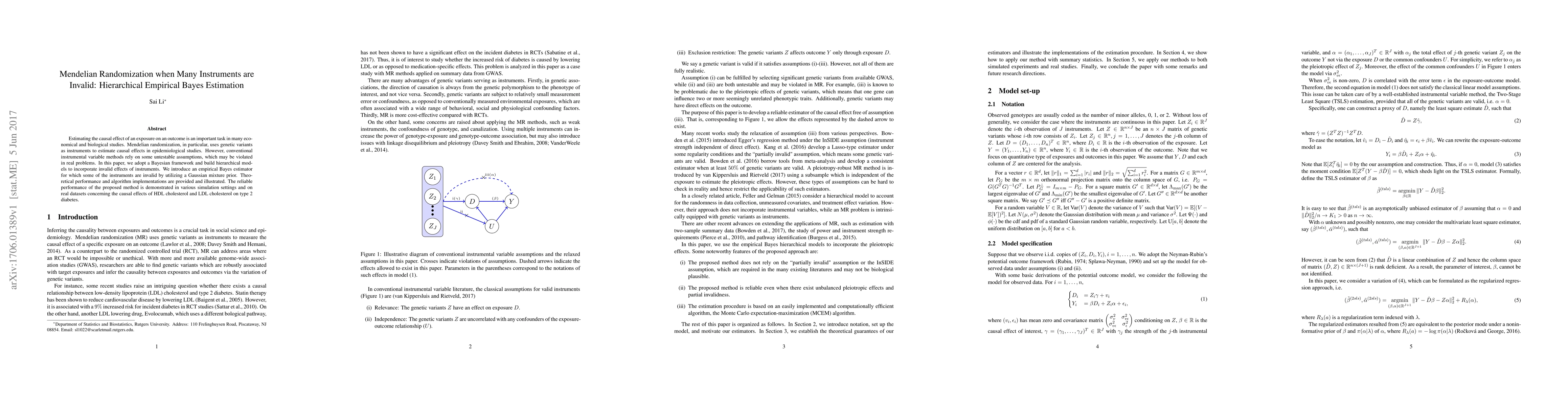 The paper develops empirical Bayes hierarchical models for estimating causal effects in the presence of invalid instruments for Mendelian Randomization (MR) studies, utilizing regularization structure to share information across the hierarchy.