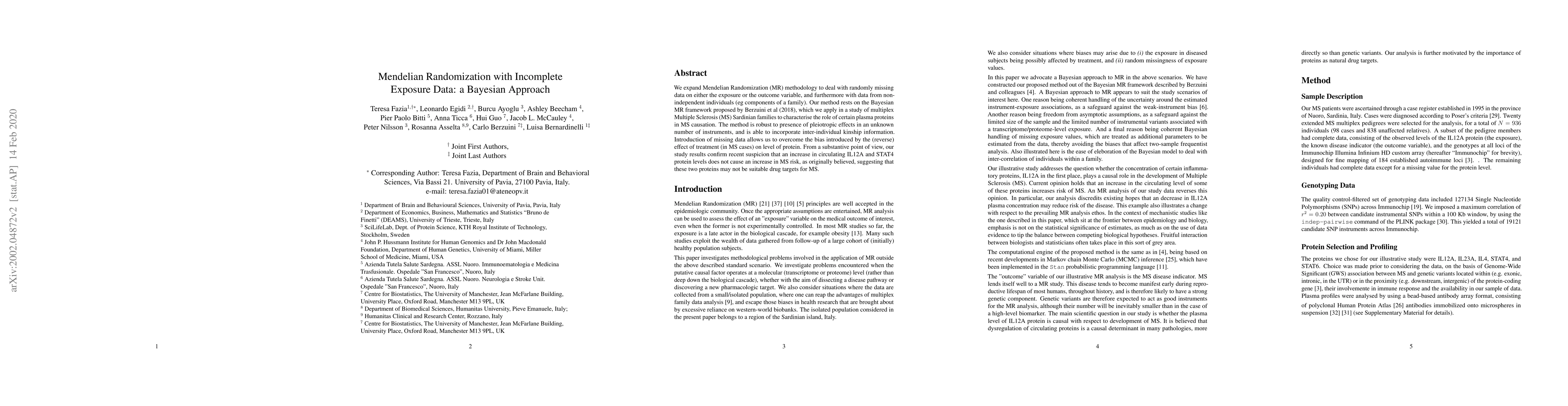 This paper proposes a Bayesian approach to Mendelian Randomization (MR) that accommodates missing data and nonindependent individuals, applying it to study multiplex MS Sardinian families. The method reveals that increased IL12A and STAT4 protein levels do not causally increase MS risk, challenging their suitability as drug targets.