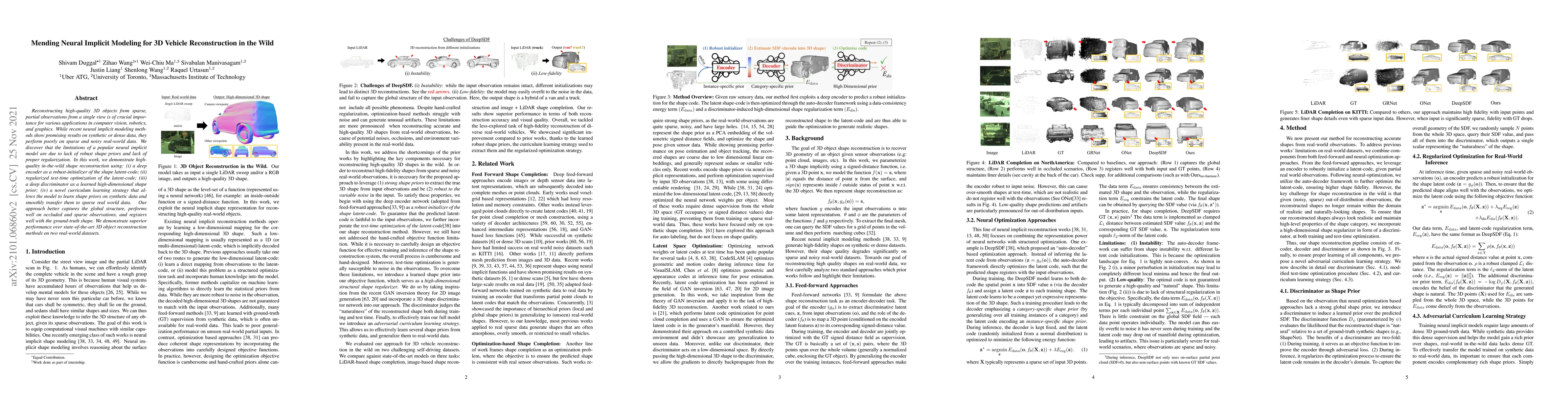 This paper proposes an improved neural implicit modeling method for reconstructing high-quality 3D vehicle shapes from sparse, real-world observations. It introduces a deep encoder, regularized optimization, a discriminator for shape priors, and curriculum learning to enhance performance on sparse and noisy data, achieving better results than existing methods on real-world datasets.