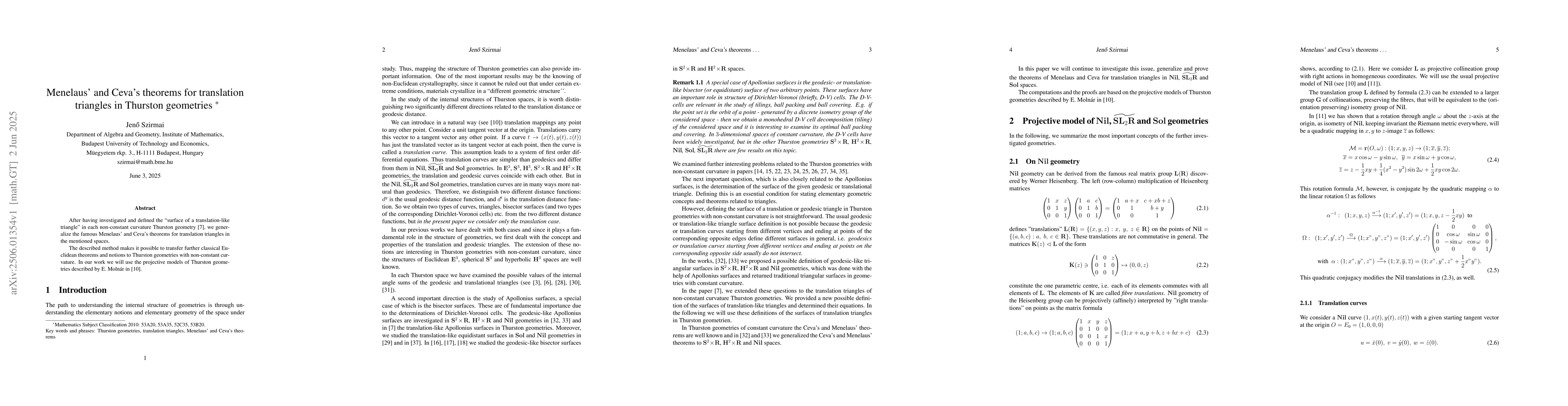 Development of a method to generalize Menelaus' and Ceva's theorems for translation triangles in Thurston geometries with non-constant curvature.