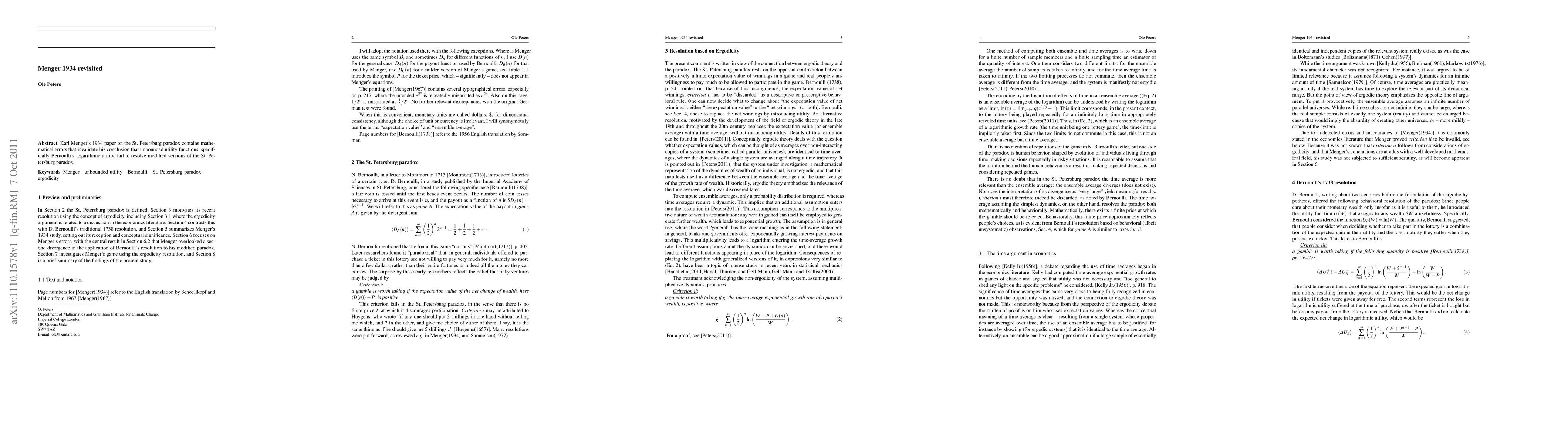 Karl Menger's 1934 paper on the St. Petersburg paradox contains mathematical errors that invalidate his conclusion that unbounded utility functions, specifically Bernoulli's logarithmic utility, fail to resolve modified versions of the St. Petersburg paradox.