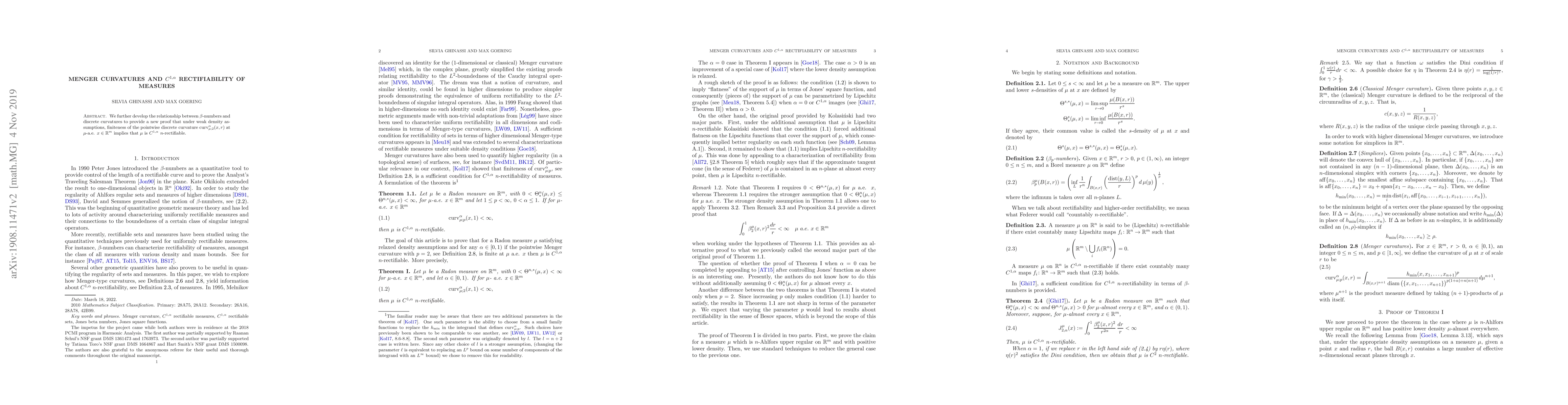 We further develop the relationship between $\beta$-numbers and discrete curvatures to provide a new proof that under weak density assumptions, finiteness of the pointwise discrete curvature $\operatorname{curv}^{\alpha}_{\mu;2}(x,r)$ at $\mu$- a.e. $x \in \mathbb{R}^{m}$ implies that $\mu$ is $C^{1,\alpha}$ $n$-rectifiable.