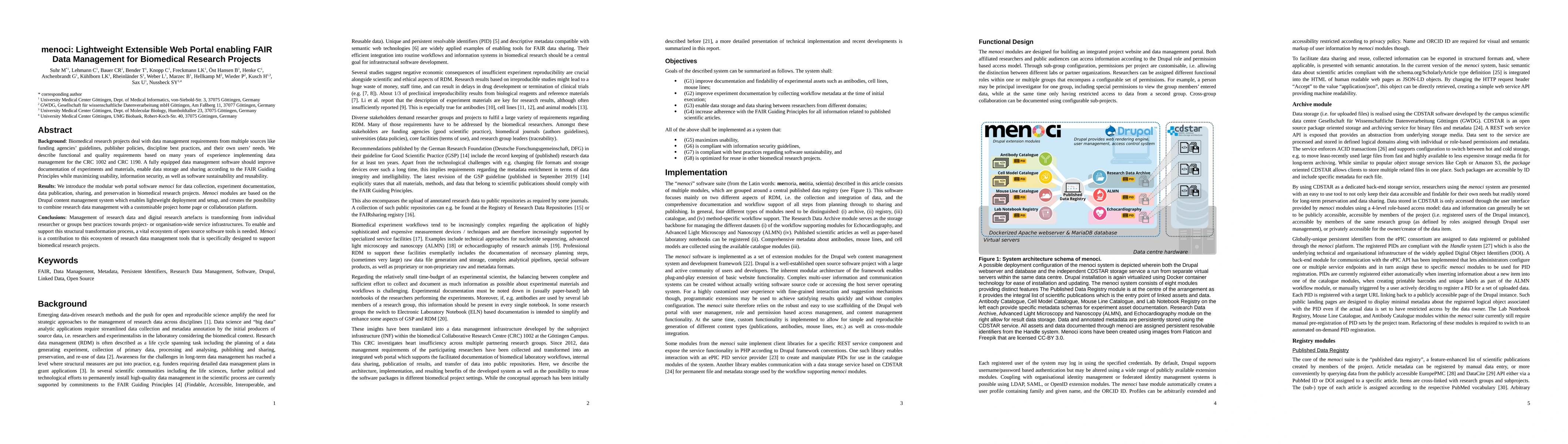 Menoci is a lightweight, extensible web portal designed to facilitate FAIR data management for biomedical research projects, built on the Drupal CMS for easy deployment and customization. It aims to improve data documentation, storage, sharing, and preservation, supporting the transition from individual best practices to project-wide infrastructures.