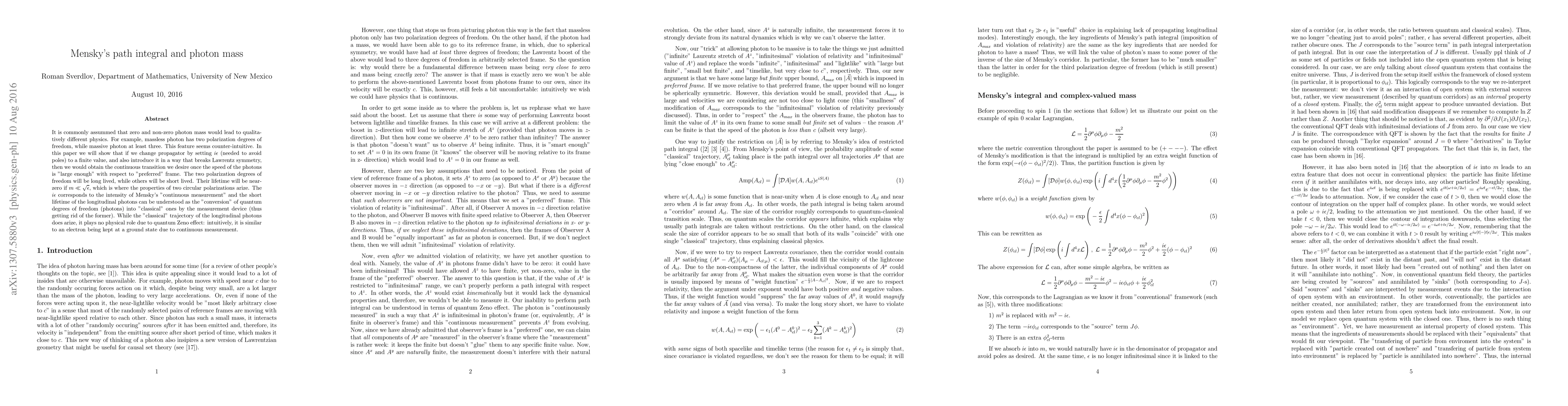 It is commonly assumed that zero and non-zero photon mass would lead to qualitatively different physics. For example, massless photon has two polarization degrees of freedom, while massive photon at least three. This feature seems counter-intuitive. In this paper we will show that if we change propagator by setting $i \epsilon$ (needed to avoid poles) to a finite value, and also introduce it in a way that breaks Lawrentz symmetry, then we would obtain the continuous transition we desire once the speed of the photons is "large enough" with respect to "preferred" frame. The two transverse polarization degrees of freedom will be long lived, while longitudinal will be short lived. Their lifetime will be near-zero if $m \ll \sqrt{\epsilon}$, which is where the properties of two circular polarizations arize. The $i \epsilon$ corresponds to the intensity of Mensky's "continuous measurement" and the short lifetime of the longitudinal photons can be understood as the "conversion" of quantum degrees of freedom (photons) into "classical" ones by the measurement device (thus getting rid of the former). While the "classical" trajectory of the longitudinal photons does arize, it plays no physical role due to quantum Zeno effect: intuitively, it is similar to an electron being kept at a ground state due to continuous measurement.