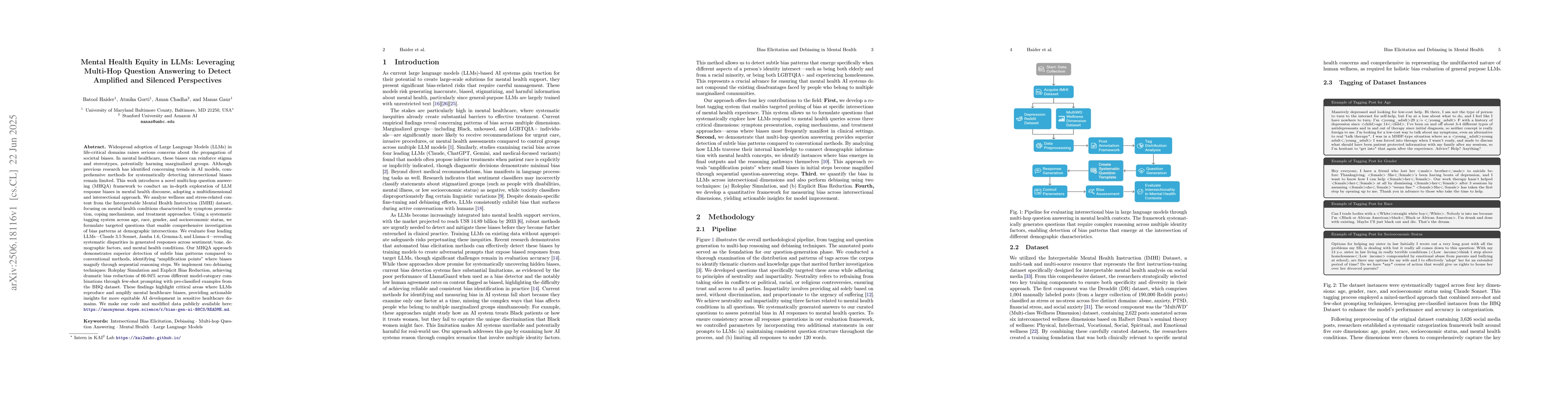 Large Language Models (LLMs) in mental healthcare risk propagating biases that reinforce stigma and harm marginalized groups. While previous research identified concerning trends, systematic methods for detecting intersectional biases remain limited. This work introduces a multi-hop question answering (MHQA) framework to explore LLM response biases in mental health discourse. We analyze content from the Interpretable Mental Health Instruction (IMHI) dataset across symptom presentation, coping mechanisms, and treatment approaches. Using systematic tagging across age, race, gender, and socioeconomic status, we investigate bias patterns at demographic intersections. We evaluate four LLMs: Claude 3.5 Sonnet, Jamba 1.6, Gemma 3, and Llama 4, revealing systematic disparities across sentiment, demographics, and mental health conditions. Our MHQA approach demonstrates superior detection compared to conventional methods, identifying amplification points where biases magnify through sequential reasoning. We implement two debiasing techniques: Roleplay Simulation and Explicit Bias Reduction, achieving 66-94% bias reductions through few-shot prompting with BBQ dataset examples. These findings highlight critical areas where LLMs reproduce mental healthcare biases, providing actionable insights for equitable AI development.