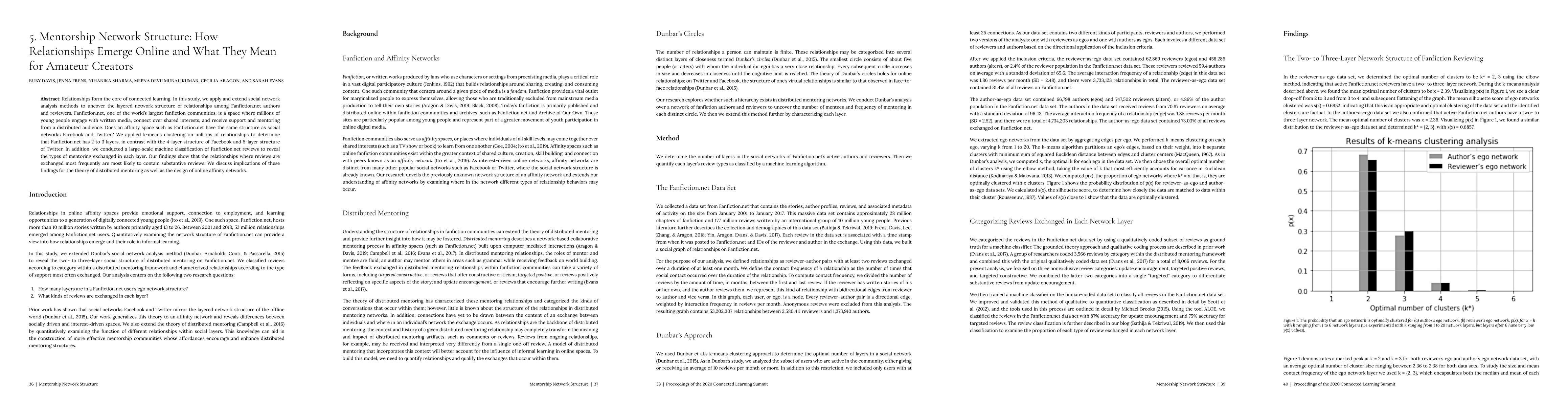 Relationships form the core of connected learning. In this study, we apply and extend social network analysis methods to uncover the layered network structure of relationships among Fanfiction.net authors and reviewers. Fanfiction.net, one of the world's largest fanfiction communities, is a space where millions of young people engage with written media, connect over shared interests, and receive support and mentoring from a distributed audience. Does an affinity space such as Fanfiction.net have the same structure as social networks Facebook and Twitter? We applied k-means clustering on millions of relationships to determine that Fanfiction.net has 2 to 3 layers, in contrast with the 4-layer structure of Facebook and 5-layer structure of Twitter. In addition, we conducted a large-scale machine classification of Fanfiction.net reviews to reveal the types of mentoring exchanged in each layer. Our findings show that the relationships where reviews are exchanged most frequently are most likely to contain substantive reviews. We discuss implications of these findings for the theory of distributed mentoring as well as the design of online affinity networks.