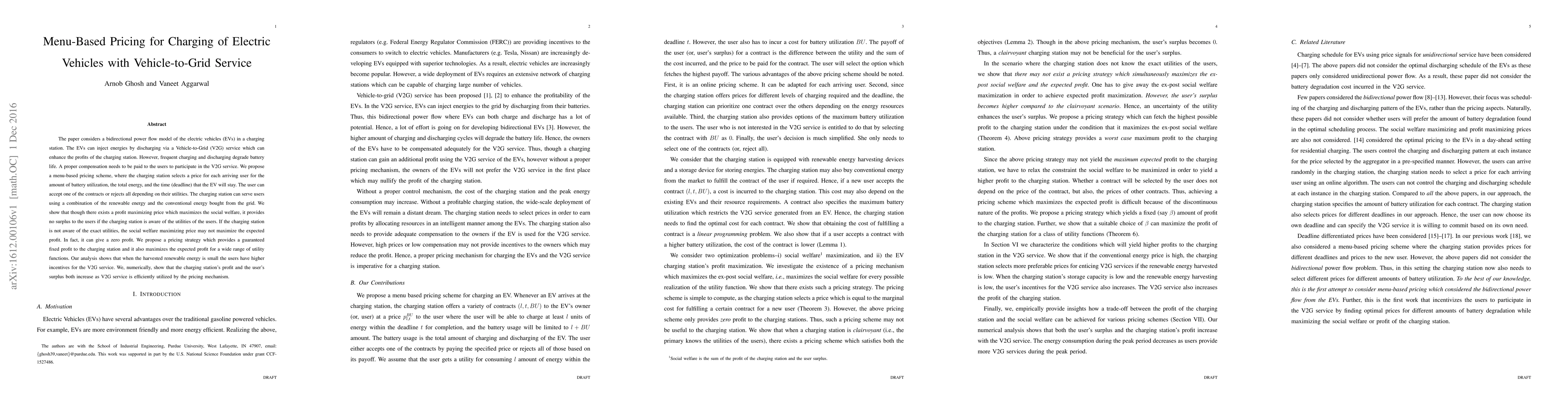 The paper considers a bidirectional power flow model of the electric vehicles (EVs) in a charging station. The EVs can inject energies by discharging via a Vehicle-to-Grid (V2G) service which can enhance the profits of the charging station. However, frequent charging and discharging degrade battery life. A proper compensation needs to be paid to the users to participate in the V2G service. We propose a menu-based pricing scheme, where the charging station selects a price for each arriving user for the amount of battery utilization, the total energy, and the time (deadline) that the EV will stay. The user can accept one of the contracts or rejects all depending on their utilities. The charging station can serve users using a combination of the renewable energy and the conventional energy bought from the grid. We show that though there exists a profit maximizing price which maximizes the social welfare, it provides no surplus to the users if the charging station is aware of the utilities of the users. If the charging station is not aware of the exact utilities, the social welfare maximizing price may not maximize the expected profit. In fact, it can give a zero profit. We propose a pricing strategy which provides a guaranteed fixed profit to the charging station and it also maximizes the expected profit for a wide range of utility functions. Our analysis shows that when the harvested renewable energy is small the users have higher incentives for the V2G service. We, numerically, show that the charging station's profit and the user's surplus both increase as V2G service is efficiently utilized by the pricing mechanism.