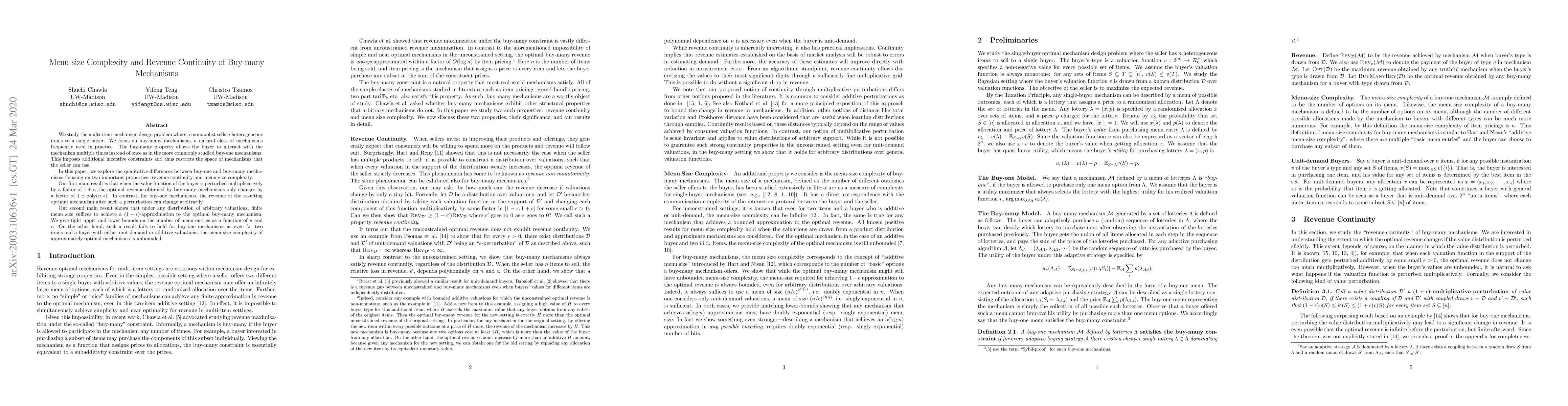 We study the multi-item mechanism design problem where a monopolist sells $n$ heterogeneous items to a single buyer. We focus on buy-many mechanisms, a natural class of mechanisms frequently used in practice. The buy-many property allows the buyer to interact with the mechanism multiple times instead of once as in the more commonly studied buy-one mechanisms. This imposes additional incentive constraints and thus restricts the space of mechanisms that the seller can use. In this paper, we explore the qualitative differences between buy-one and buy-many mechanisms focusing on two important properties: revenue continuity and menu-size complexity. Our first main result is that when the value function of the buyer is perturbed multiplicatively by a factor of $1\pm\epsilon$, the optimal revenue obtained by buy-many mechanisms only changes by a factor of $1 \pm \textrm{poly}(n,\epsilon)$. In contrast, for buy-one mechanisms, the revenue of the resulting optimal mechanism after such a perturbation can change arbitrarily. Our second main result shows that under any distribution of arbitrary valuations, finite menu size suffices to achieve a $(1-\epsilon)$-approximation to the optimal buy-many mechanism. We give tight upper and lower bounds on the number of menu entries as a function of $n$ and $\epsilon$. On the other hand, such a result fails to hold for buy-one mechanisms as even for two items and a buyer with either unit-demand or additive valuations, the menu-size complexity of approximately optimal mechanisms is unbounded.