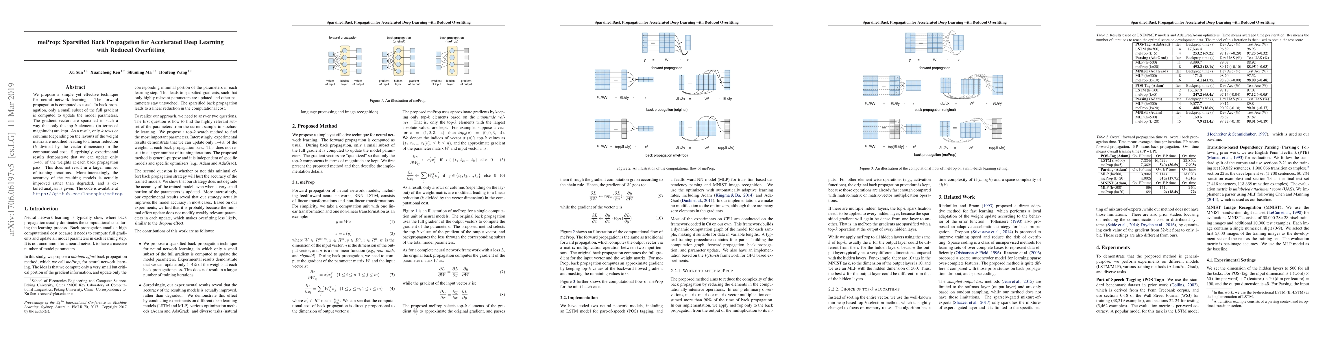 Title: meProp: Sparsified Back Propagation for Accelerated Deep Learning with Reduced Overfitting Summary: This paper introduces meProp, a technique that sparsifies back propagation by updating only the top-$k$ gradient elements, significantly reducing computational cost while maintaining or improving model accuracy. Experimental results show that updating just 1-4% of weights per pass can lead to faster training and better performance.