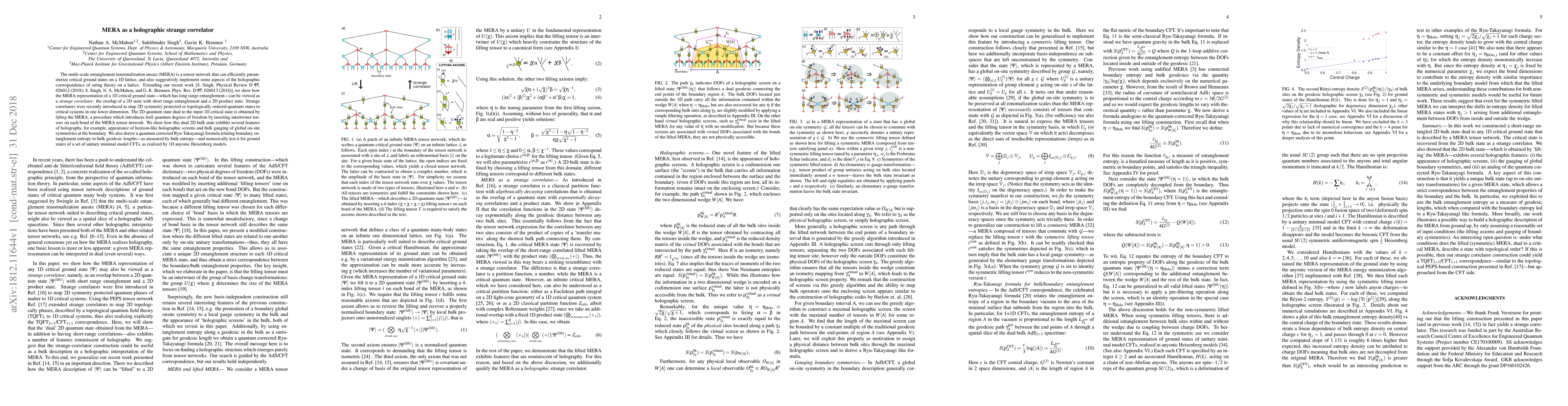 The paper demonstrates how the multi-scale entanglement renormalization ansatz (MERA) can represent 1D critical ground states as strange correlators, revealing holographic features through a dual 2D bulk state, and tests a quantum corrected Ryu-Takayanagi formula for entanglement entropy.