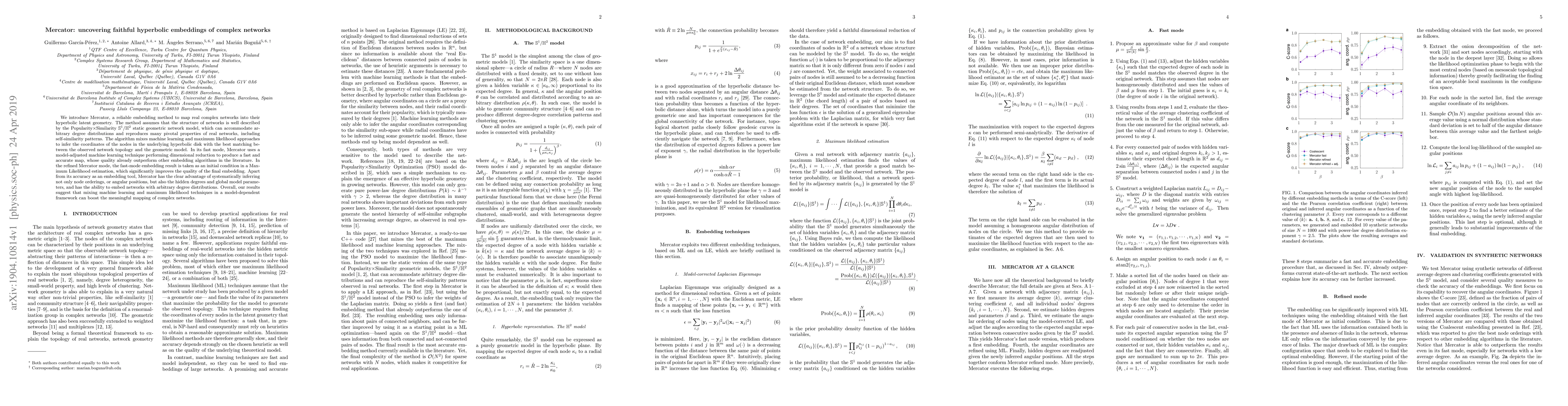 Mercator is a novel embedding method that maps complex networks into hyperbolic space, leveraging machine learning and maximum likelihood techniques to accurately reflect network structures. It infers not only node positions but also hidden degrees and global model parameters, outperforming existing algorithms in both speed and accuracy.