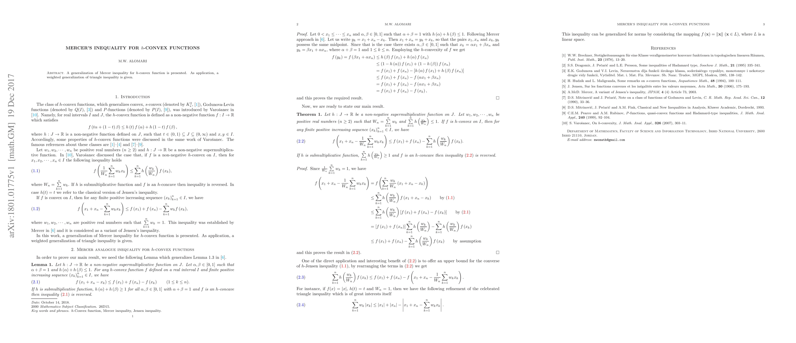 A generalization of Mercer inequality for h-convex function is presented. As application, a weighted generalization of triangle inequality is given.