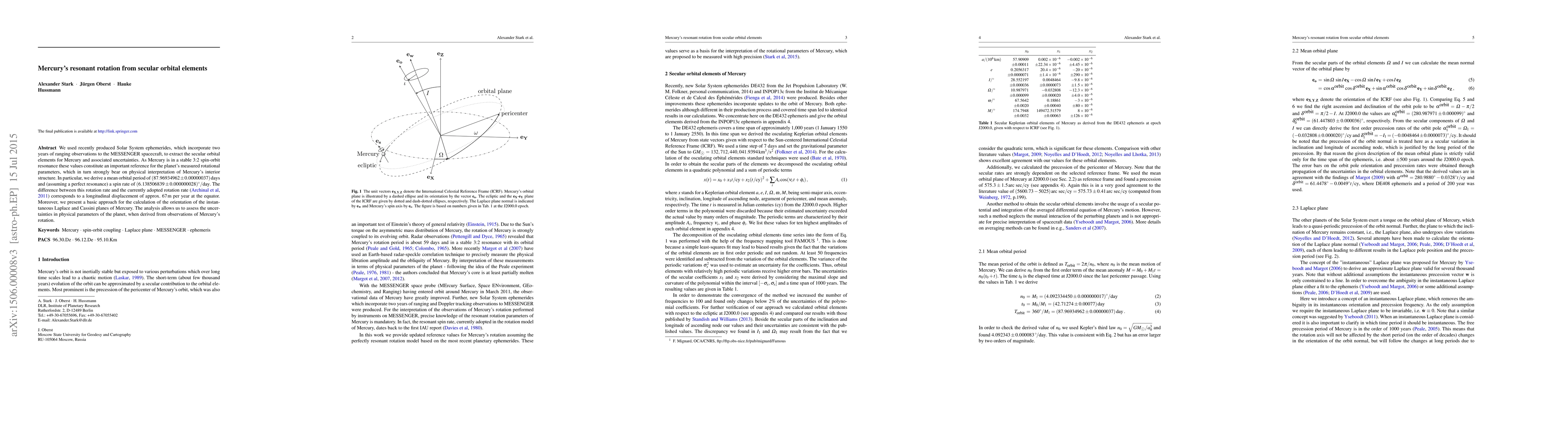 This paper determines Mercury's precise spin-orbit resonance, deriving a mean orbital period and a spin rate, which refines the understanding of Mercury's interior structure and highlights a significant difference from previously adopted rotation rates. It also outlines a method for calculating Mercury's rotational planes.