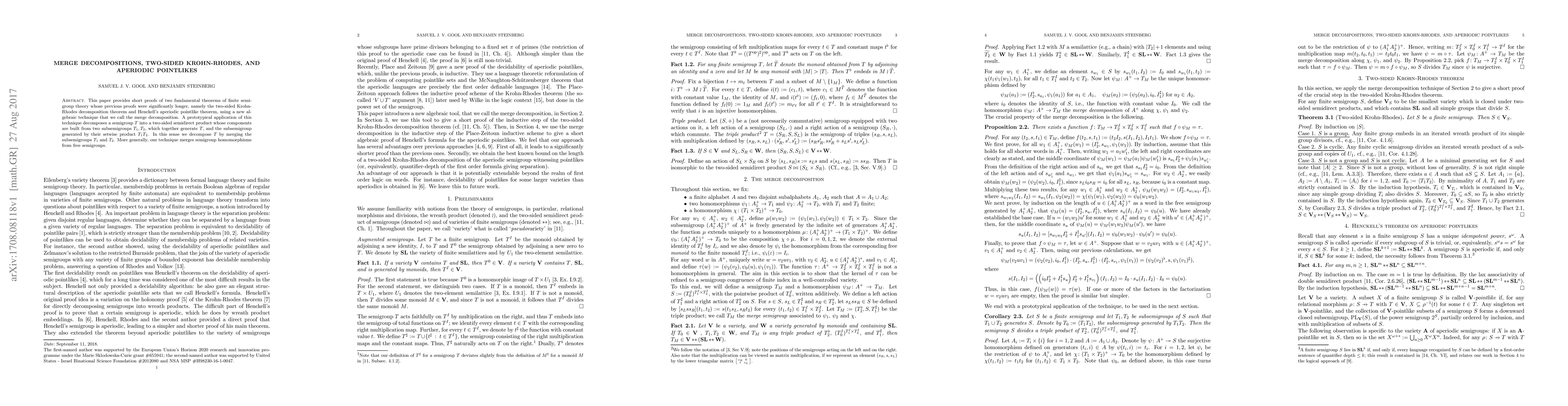 This paper provides short proofs of two fundamental theorems of finite semigroup theory whose previous proofs were significantly longer, namely the two-sided Krohn-Rhodes decomposition theorem and Henckell's aperiodic pointlike theorem, using a new algebraic technique that we call the merge decomposition. A prototypical application of this technique decomposes a semigroup $T$ into a two-sided semidirect product whose components are built from two subsemigroups $T_1,T_2$, which together generate $T$, and the subsemigroup generated by their setwise product $T_1T_2$. In this sense we decompose $T$ by merging the subsemigroups $T_1$ and $T_2$. More generally, our technique merges semigroup homomorphisms from free semigroups.