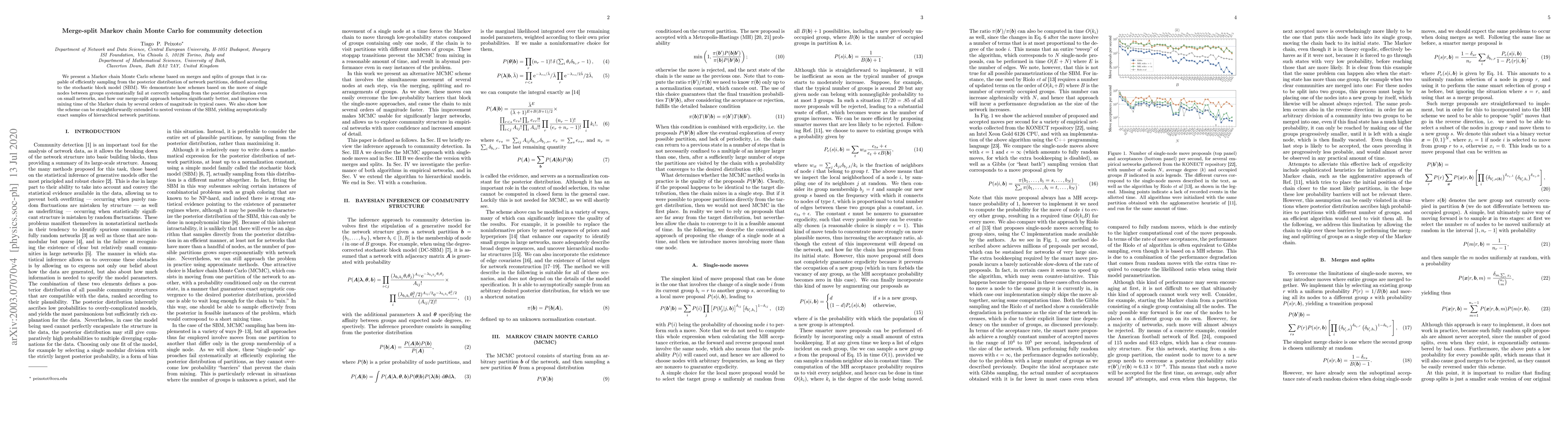 This paper introduces a merge-split Markov chain Monte Carlo method for community detection in networks, demonstrating superior performance over traditional single-node move methods. The proposed approach significantly enhances the mixing time and provides asymptotically exact samples for hierarchical partitions under the stochastic block model.