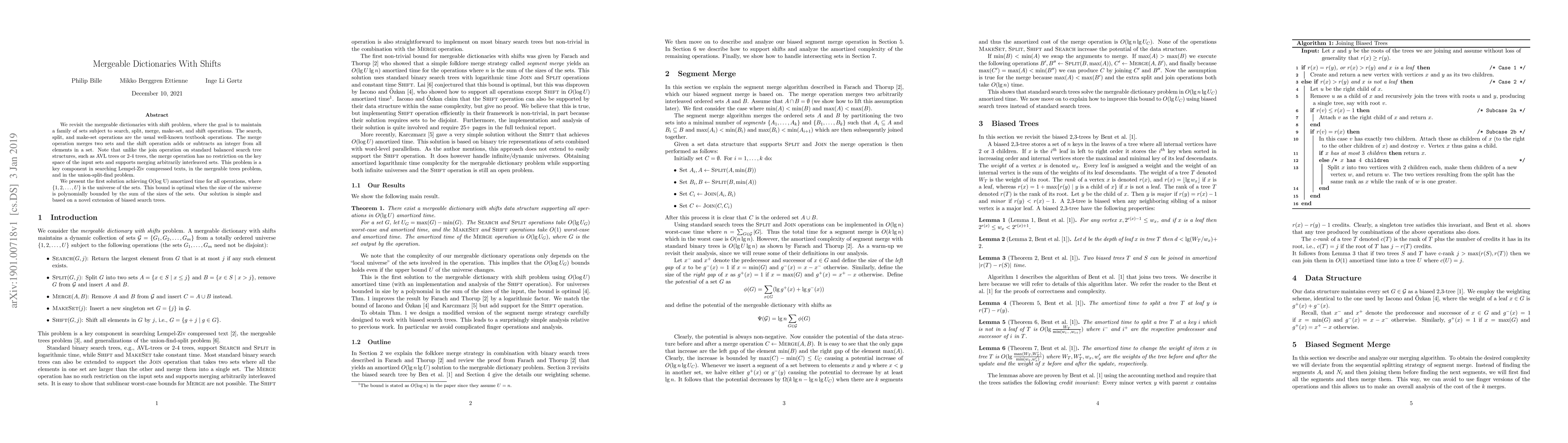 We revisit the mergeable dictionaries with shift problem, where the goal is to maintain a family of sets subject to search, split, merge, make-set, and shift operations. The search, split, and make-set operations are the usual well-known textbook operations. The merge operation merges two sets and the shift operation adds or subtracts an integer from all elements in a set. Note that unlike the join operation on standard balanced search tree structures, such as AVL trees or 2-4 trees, the merge operation has no restriction on the key space of the input sets and supports merging arbitrarily interleaved sets. This problem is a key component in searching Lempel-Ziv compressed texts, in the mergeable trees problem, and in the union-split-find problem. We present the first solution achieving O(log U) amortized time for all operations, where {1, 2, ..., U} is the universe of the sets. This bound is optimal when the size of the universe is polynomially bounded by the sum of the sizes of the sets. Our solution is simple and based on a novel extension of biased search trees.