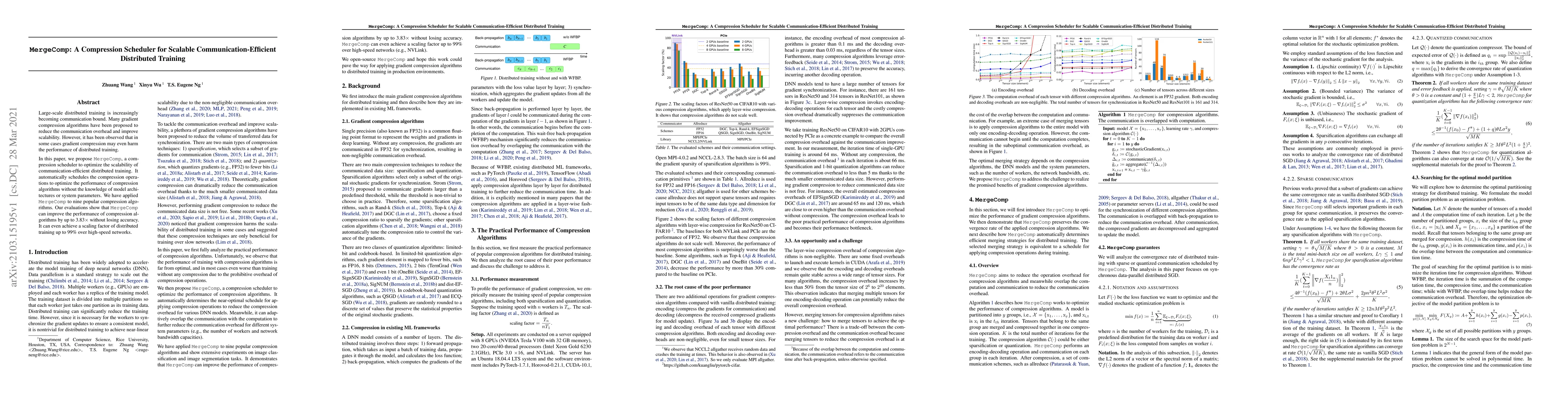 MergeComp is a novel compression scheduler designed to enhance the scalability of distributed training by optimizing communication efficiency. It dynamically schedules gradient compression operations, improving performance across various compression algorithms without requiring knowledge of model or system specifics, achieving up to 3.83x performance gains and 99% scaling factor.