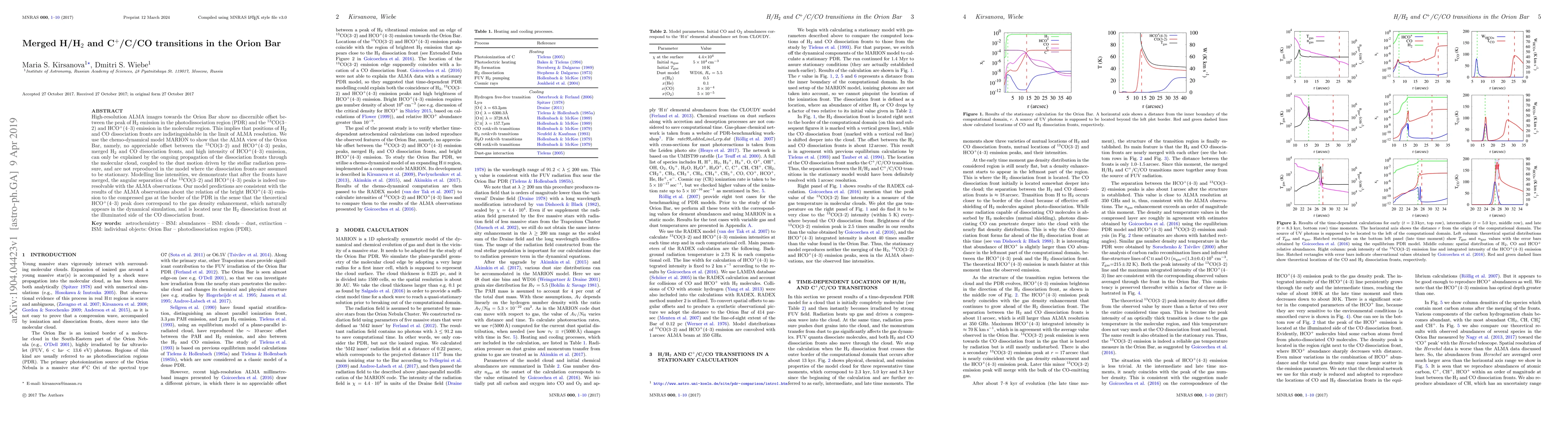High-resolution ALMA images towards the Orion Bar show no discernible offset between the peak of H2 emission in the photodissociation region (PDR) and the CO(3-2) and HCO+(4-3) emission in the molecular region. This implies that positions of H2 and CO dissociation fronts are indistinguishable in the limit of ALMA resolution. We use the chemo-dynamical model MARION to show that the ALMA view of the Orion Bar, namely, no appreciable offset between the CO(3-2) and HCO+(4-3) peaks, merged H2 and CO dissociation fronts, and high intensity of HCO+(4-3) emission, can only be explained by the ongoing propagation of the dissociation fronts through the molecular cloud, coupled to the dust motion driven by the stellar radiation pressure, and are not reproduced in the model where the dissociation fronts are assumed to be stationary. Modelling line intensities, we demonstrate that after the fronts have merged, the angular separation of the CO(3-2) and HCO+(4-3) peaks is indeed unresolvable with the ALMA observations. Our model predictions are consistent with the results of the ALMA observations about the relation of the bright HCO+(4-3) emission to the compressed gas at the border of the PDR in the sense that the theoretical HCO+(4-3) peak does correspond to the gas density enhancement, which naturally appears in the dynamical simulation, and is located near the H2 dissociation front at the illuminated side of the CO dissociation front.