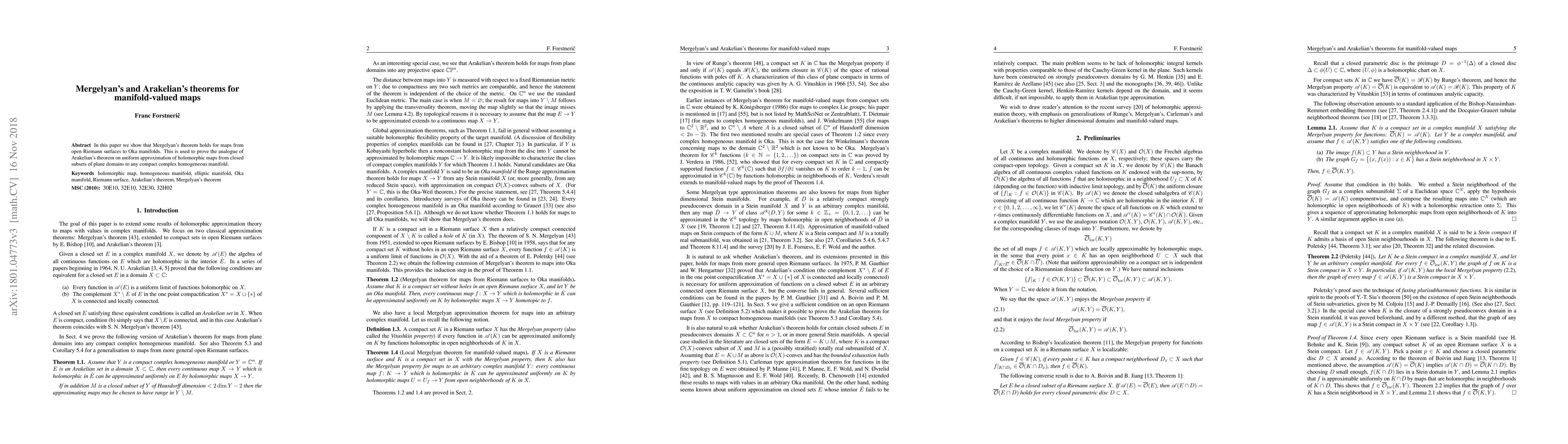This paper demonstrates that Mergelyan's theorem applies to maps from open Riemann surfaces to Oka manifolds. It further proves Arakelian's theorem analogue for uniform approximation of holomorphic maps from closed subsets of the complex plane to any compact complex homogeneous manifold.