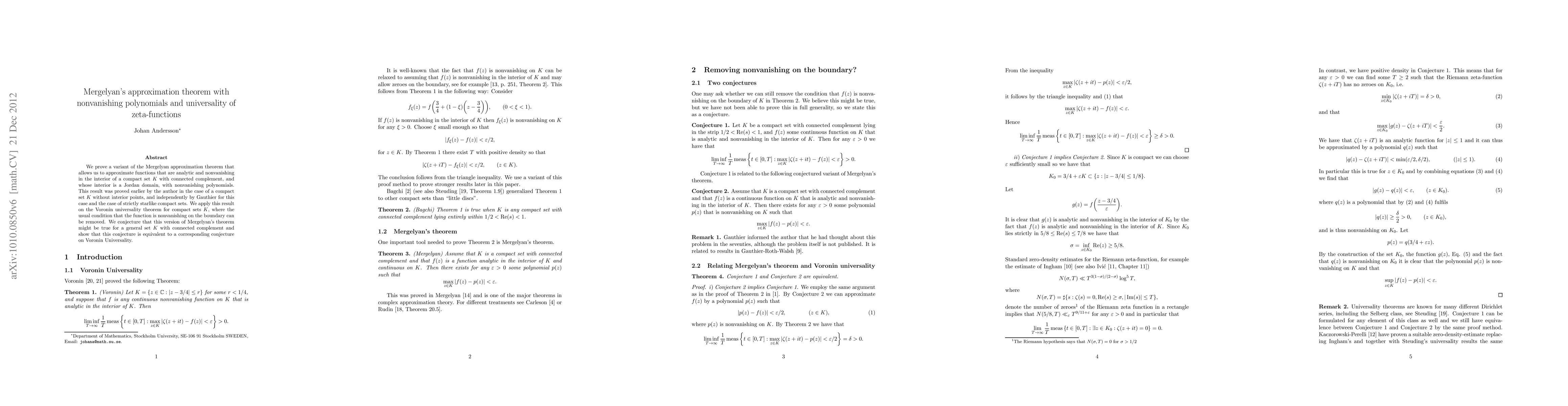 Researchers have proved a variant of Mergelyan's approximation theorem allowing for functions with nonvanishing polynomials to approximate analytic functions in compact sets with connected complements.