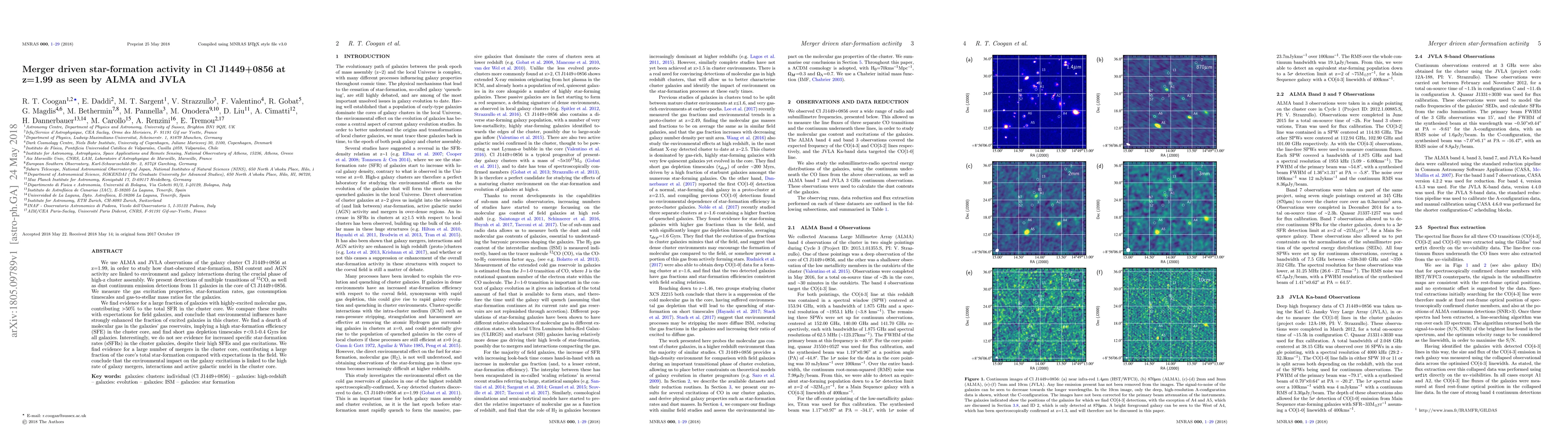 This study using ALMA and JVLA observations reveals that galaxy mergers in the high-z cluster Cl J1449+0856 at z=1.99 significantly drive star-formation activity, with a high fraction of galaxies exhibiting highly-excited molecular gas and a high star-formation efficiency despite no increased specific star-formation rates.
