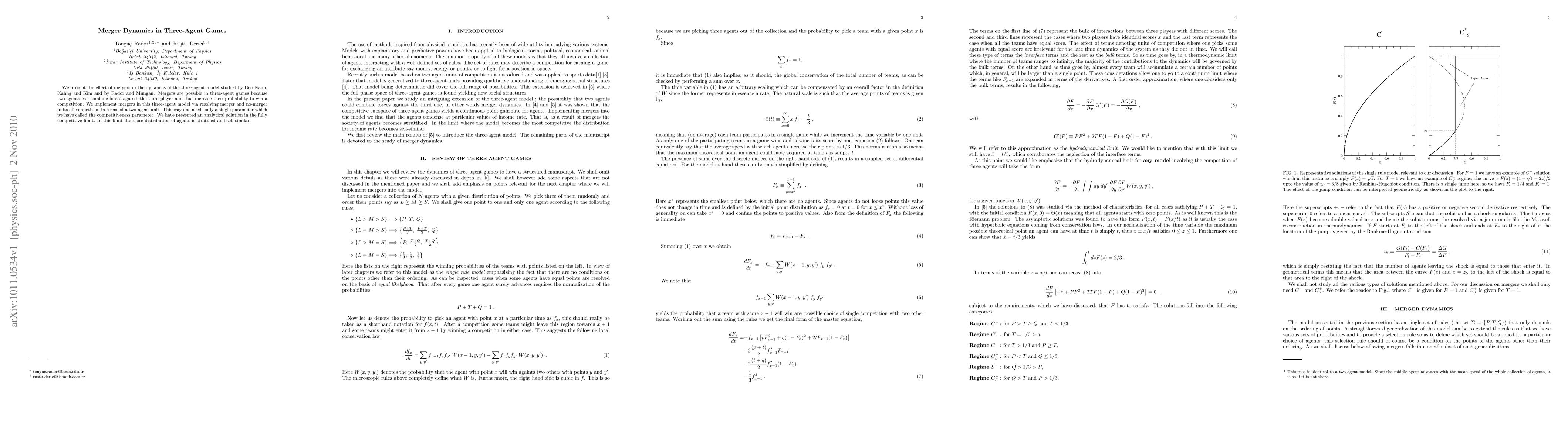 We present the effect of mergers in the dynamics of the three-agent model studied by Ben-Naim, Kahng and Kim and by Rador and Mungan. Mergers are possible in three-agent games because two agents can combine forces against the third player and thus increase their probability to win a competition. We implement mergers in this three-agent model via resolving merger and no-merger units of competition in terms of a two-agent unit. This way one needs only a single parameter which we have called the competitiveness parameter. We have presented an analytical solution in the fully competitive limit. In this limit the score distribution of agents is stratified and self-similar.