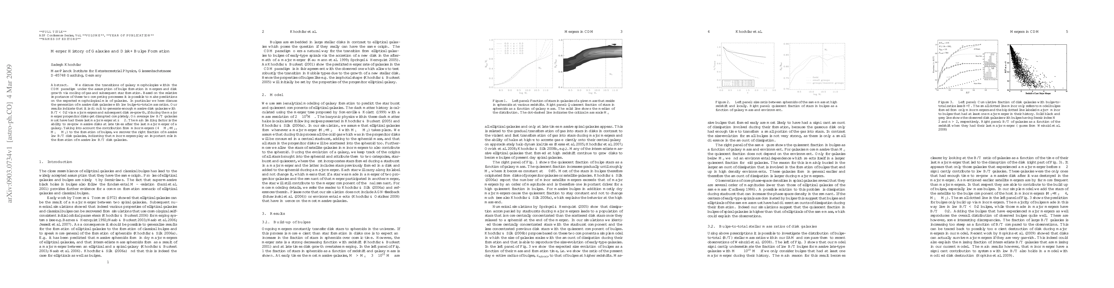 This paper explores galaxy morphology transitions within the CDM framework, focusing on the formation of massive disk galaxies with low bulge-to-total mass ratios. It finds that major mergers disrupting progenitor disks hinder the generation of such low B/T galaxies, suggesting they typically had their last major merger at $z \ge 2$. Minor mergers are identified as crucial for forming the observed fraction of these galaxies.