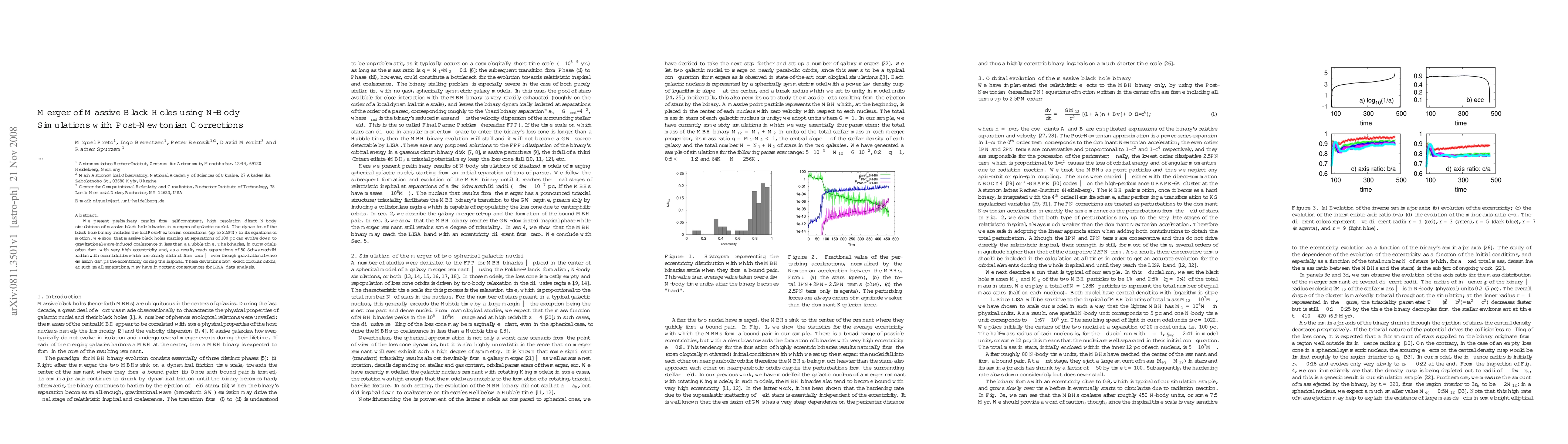 We present preliminary results from self-consistent, high resolution direct {\it N}-body simulations of massive black hole binaries in mergers of galactic nuclei. The dynamics of the black hole binary includes the full Post-Newtonian corrections (up to 2.5PN) to its equations of motion. We show that massive black holes starting at separations of 100 pc can evolve down to gravitational-wave-induced coalescence in less than a Hubble time. The binaries, in our models, often form with very high eccentricity and, as a result, reach separations of 50 Schwarzschild radius with eccentricities which are clearly distinct from zero -- even though gravitational wave emission damps the eccentricity during the inspiral. These deviations from exact circular orbits, at such small separations, may have important consequences for LISA data analysis.