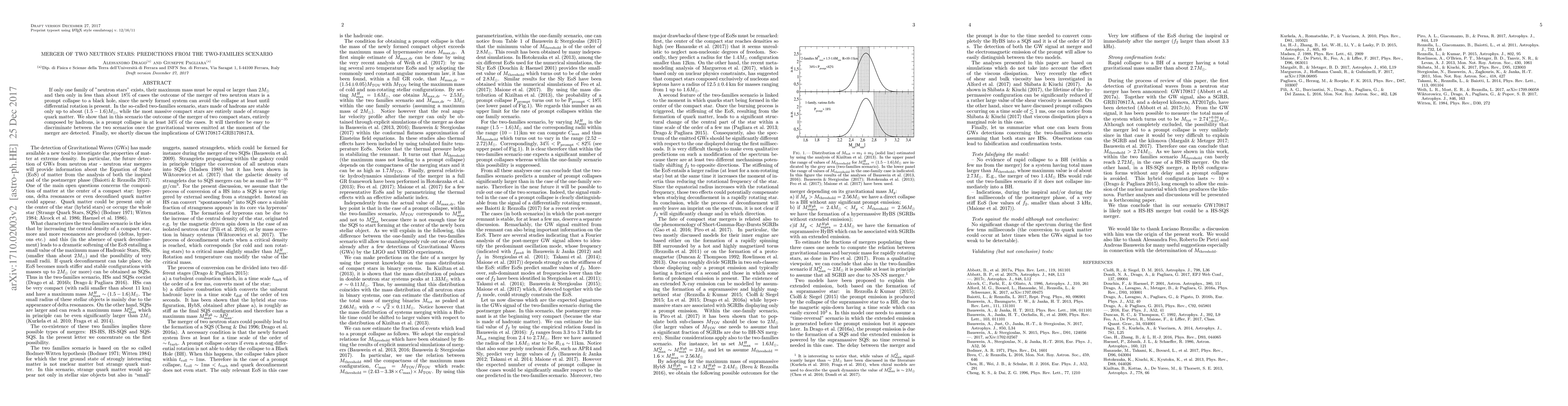 If only one family of "neutron stars" exists, their maximum mass must be equal or larger than $2 M_\odot$ and then only in less than about $18\%$ of cases the outcome of the merger of two neutron stars is a direct collapse to a black hole, since the newly formed system can avoid the collapse at least until differential rotation is present. In the so-called two-families scenario, stars made of hadrons are stable only up to about $1.5-1.6 M_\odot$, while the most massive compact stars are entirely made of strange quark matter. We show that in this scenario the outcome of the merger of two neutron stars is a prompt collapse in at least $34\%$ of the cases. It will therefore be easy to discriminate between the two scenarios once the gravitational waves emitted at the moment of the merger are detected.