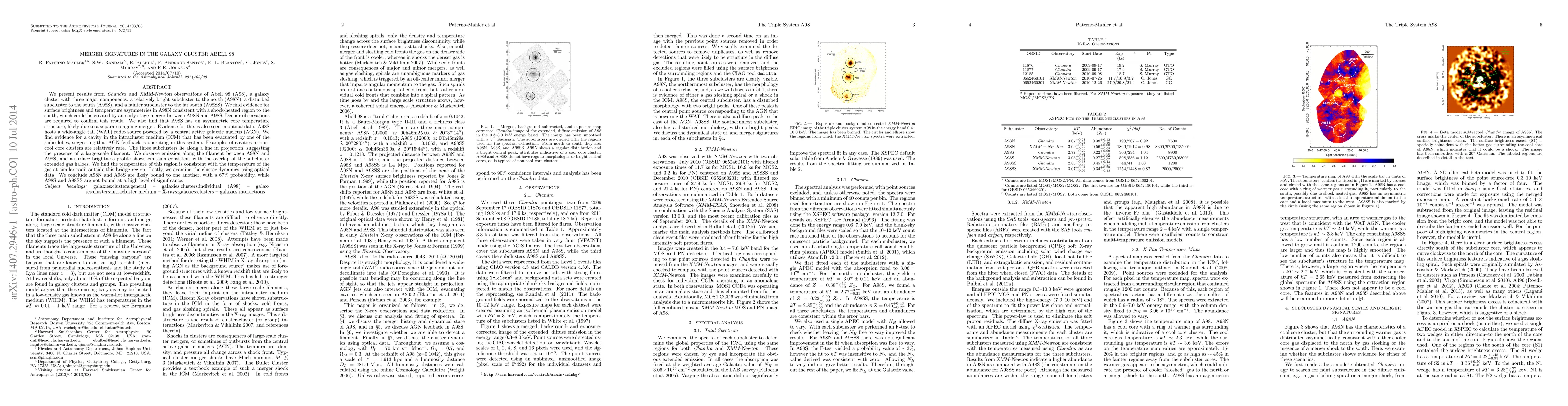 This paper reports on Chandra and XMM-Newton observations of the galaxy cluster Abell 98, revealing evidence of ongoing mergers between its subclusters, particularly between A98N and A98S, indicated by surface brightness and temperature asymmetries. Additionally, A98S shows a wide-angle tail radio source and cavities in the intracluster medium, suggesting active galactic nucleus feedback.