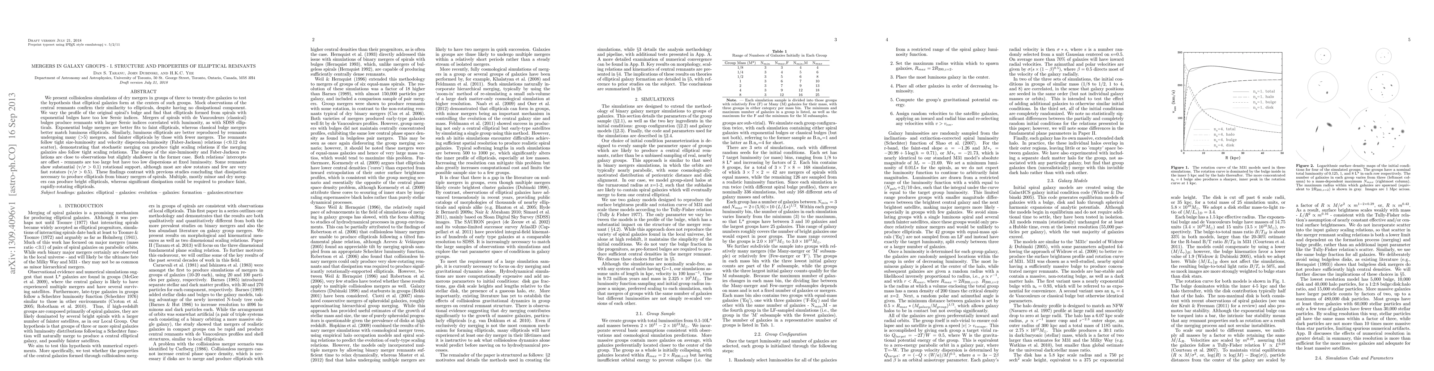 We present collisionless simulations of dry mergers in groups of three to twenty-five galaxies to test the hypothesis that elliptical galaxies form at the centers of such groups. Mock observations of the central remnants confirm their similarity to ellipticals, despite having no dissipational component. We vary the profile of the original spiral's bulge and find that ellipticals formed from spirals with exponential bulges have too low Sersic indices. Mergers of spirals with de Vaucouleurs (classical) bulges produce remnants with larger Sersic indices correlated with luminosity, as with SDSS ellipticals. Exponential bulge mergers are better fits to faint ellipticals, whereas classical bulge mergers better match luminous ellipticals. Similarly, luminous ellipticals are better reproduced by remnants undergoing many (>5) mergers, and fainter ellipticals by those with fewer mergers. The remnants follow tight size-luminosity and velocity dispersion-luminosity (Faber-Jackson) relations (<0.12 dex scatter), demonstrating that stochastic merging can produce tight scaling relations if the merging galaxies also follow tight scaling relations. The slopes of the size-luminosity and Faber-Jackson relations are close to observations but slightly shallower in the former case. Both relations' intercepts are offset - remnants are too large but have too low dispersions at fixed luminosity. Some remnants show substantial (v/\sigma > 0.1) rotational support, although most are slow rotators and few are very fast rotators (v/\sigma > 0.5). These findings contrast with previous studies concluding that dissipation necessary to produce ellipticals from binary mergers of spirals. Multiple, mostly minor and dry mergers can produce bright ellipticals, whereas significant dissipation could be required to produce faint, rapidly-rotating ellipticals.
