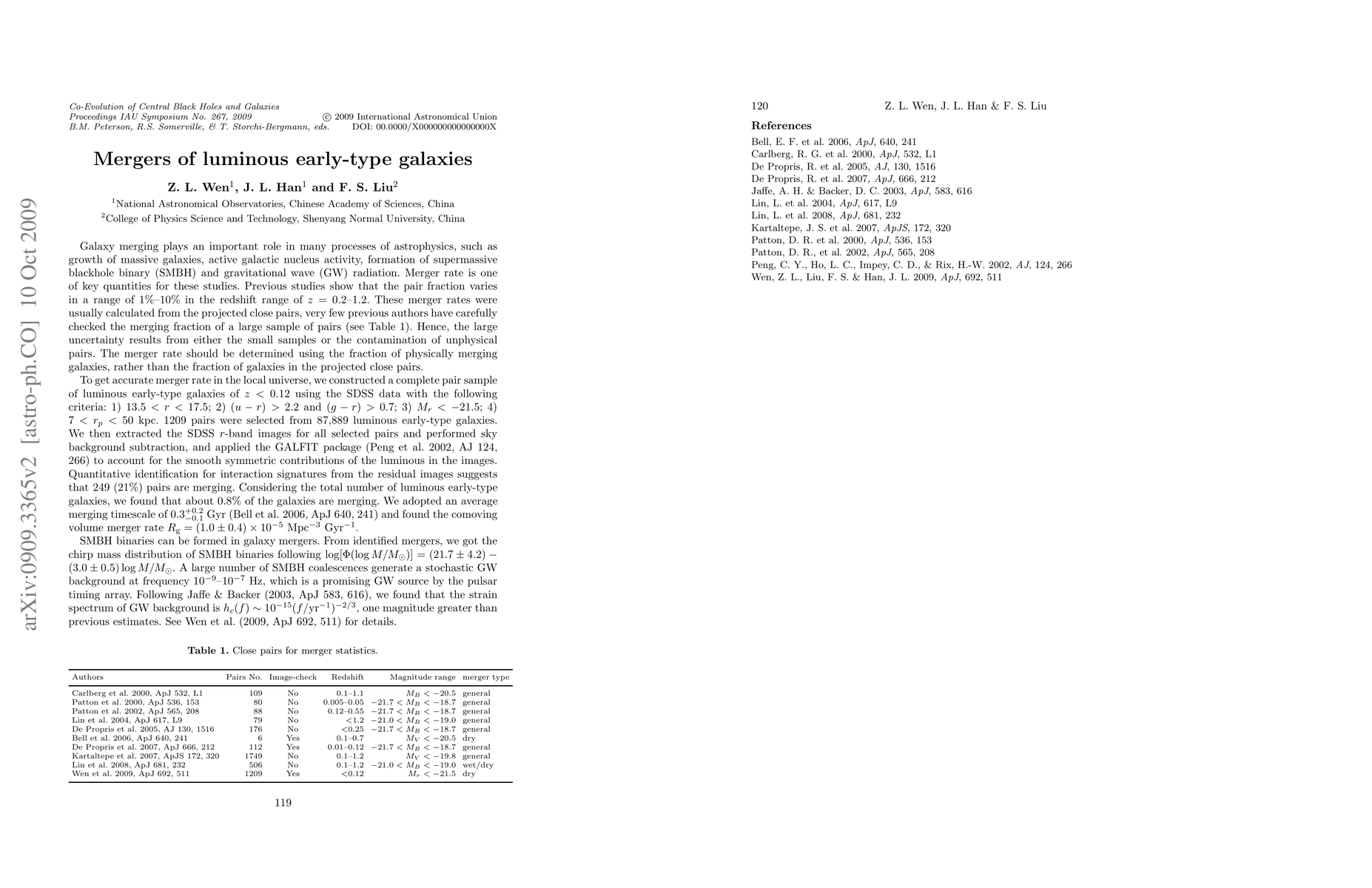 This study analyzes a large sample of luminous early-type galaxies from SDSS data, finding that about 0.8% are merging, with a derived merger rate of ~(1.0±0.4)×10^{-5} Mpc^{-3} Gyr^{-1}. It also estimates the strain amplitude of the gravitational wave background from supermassive black hole binary coalescences.