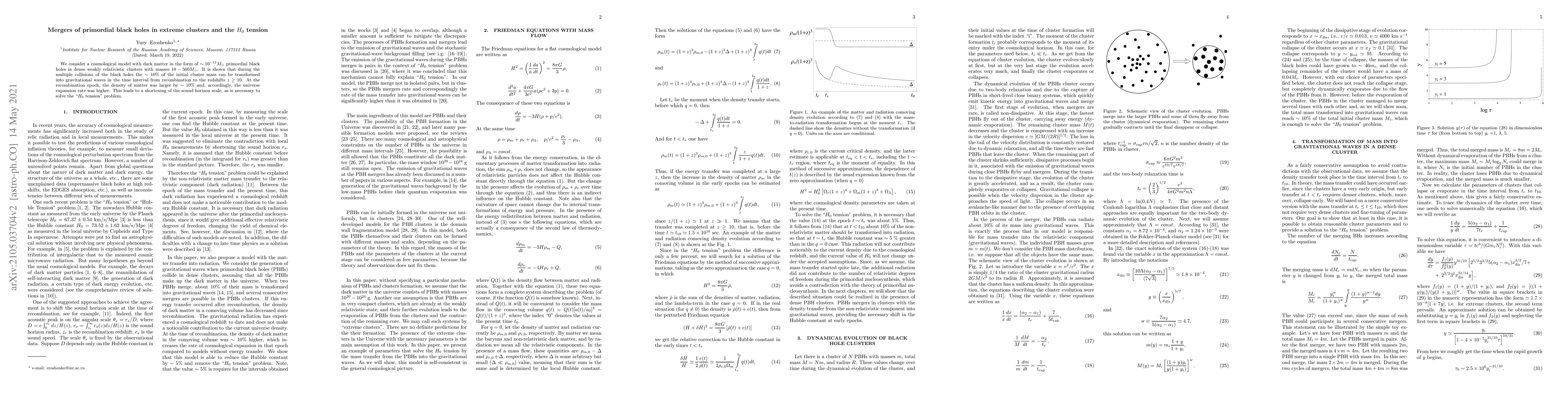 We consider a cosmological model with dark matter in the form of $\sim10^{-12}M_\odot$ primordial black holes in dense weakly relativistic clusters with masses $18-560M_\odot$. It is shown that during the multiple collisions of the black holes the $\sim10$\% of the initial cluster mass can be transformed into gravitational waves in the time interval from recombination to the redshifts $z\geq 10$. At the recombination epoch, the density of matter was larger by $\sim10$\% and, accordingly, the universe expansion rate was higher. This leads to a shortening of the sound horizon scale, as is necessary to solve the "$H_0$ tension" problem.