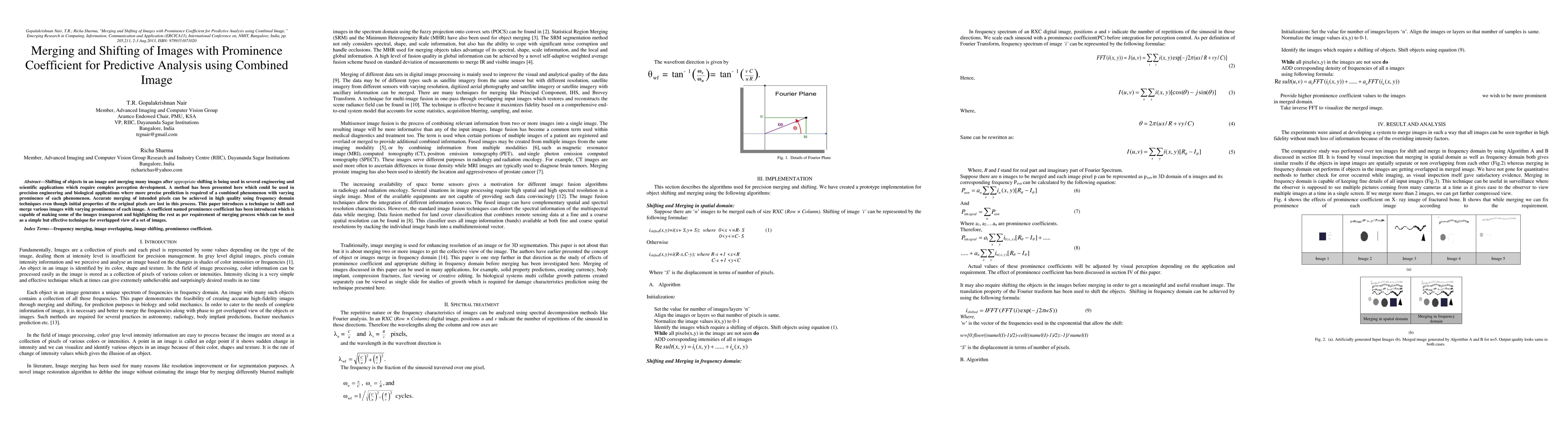 Shifting of objects in an image and merging many images after appropriate shifting is being used in several engineering and scientific applications which require complex perception development. A method has been presented here which could be used in precision engineering and biological applications where more precise prediction is required of a combined phenomenon with varying prominence of each phenomenon. Accurate merging of intended pixels can be achieved in high quality using frequency domain techniques even though initial properties of the original pixels are lost in this process. This paper introduces a technique to shift and merge various images with varying prominence of each image. A coefficient named prominence coefficient has been introduced which is capable of making some of the images transparent and highlighting the rest as per requirement of merging process which can be used as a simple but effective technique for overlapped view of a set of images.
