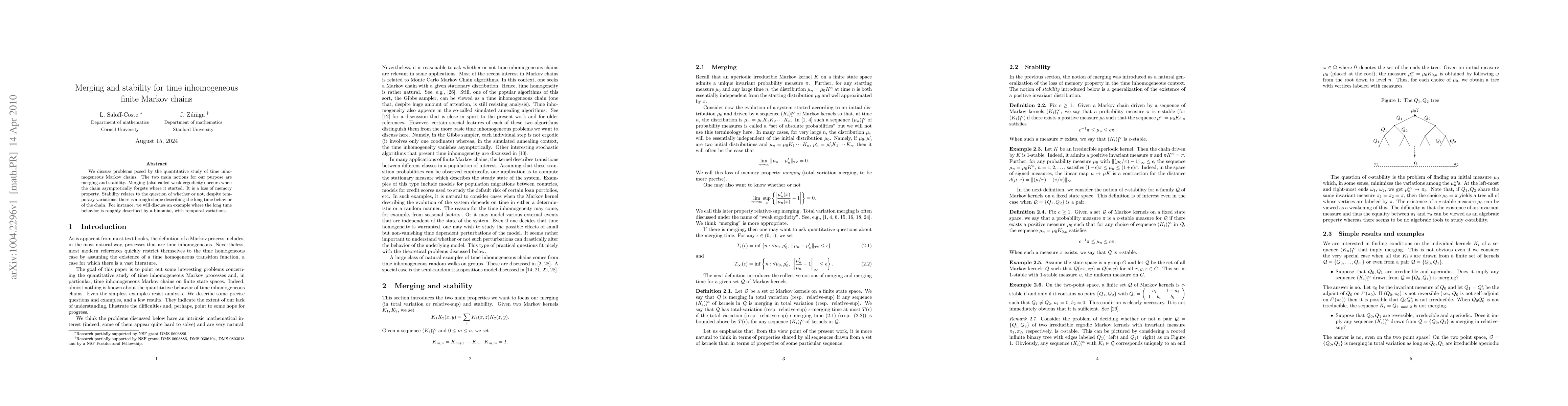 We discuss problems posed by the quantitative study of time inhomogeneous Markov chains. The two main notions for our purpose are merging and stability. Merging (also called weak ergodicity) occurs when the chain asymptotically forgets where it started. It is a loss of memory property. Stability relates to the question of whether or not, despite temporary variations, there is a rough shape describing the long time behavior of the chain. For instance, we will discuss an example where the long time behavior is roughly described by a binomial, with temporal variations.