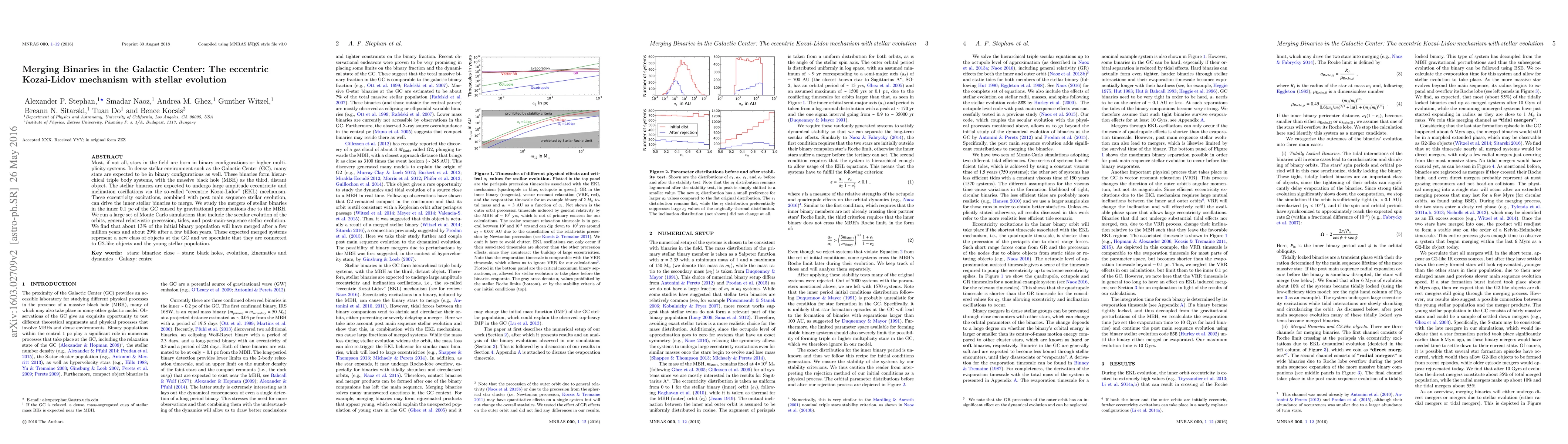 This paper investigates the merging of stellar binaries in the Galactic Center through the eccentric Kozai-Lidov mechanism, finding that about 13% merge within a few million years and 29% over a few billion years, driven by gravitational perturbations from the massive black hole. The study suggests these mergers may relate to G2-like objects and the young stellar population.