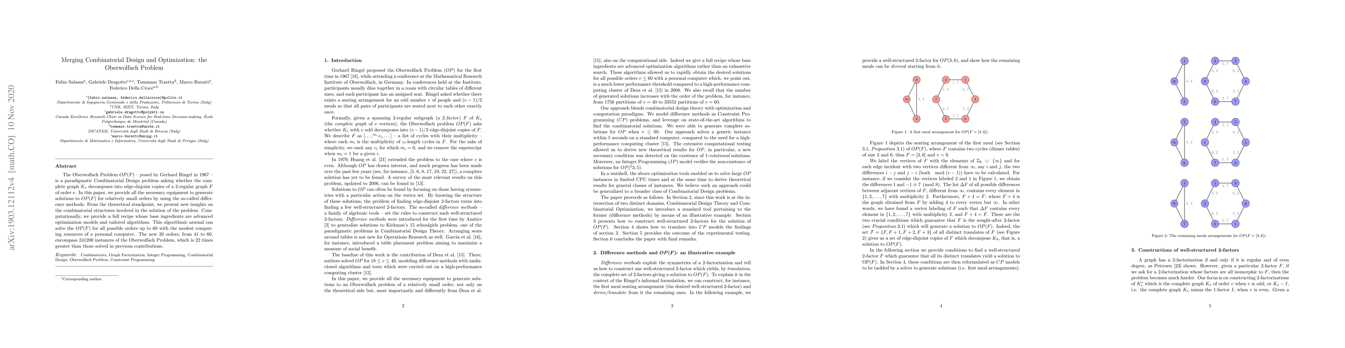 The Oberwolfach Problem $OP(F)$ -- posed by Gerhard Ringel in 1967 -- is a paradigmatic Combinatorial Design problem asking whether the complete graph $K_v$ decomposes into edge-disjoint copies of a $2$-regular graph $F$ of order $v$. In this paper, we provide all the necessary equipment to generate solutions to $OP(F)$ for relatively small orders by using the so-called difference methods. From the theoretical standpoint, we present new insights on the combinatorial structures involved in the solution of the problem. Computationally, we provide a full recipe whose base ingredients are advanced optimization models and tailored algorithms. This algorithmic arsenal can solve the $OP(F)$ for all possible orders up to $60$ with the modest computing resources of a personal computer. The new $20$ orders, from $41$ to $60$, encompass $241200$ instances of the Oberwolfach Problem, which is 22 times greater than those solved in previous contributions.