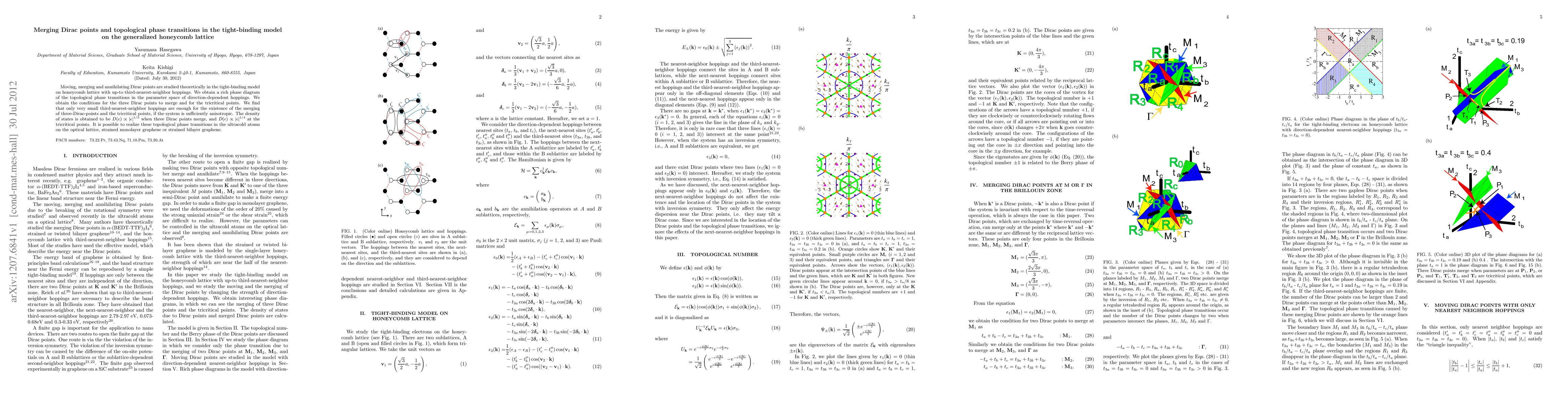 This paper investigates topological phase transitions in a tight-binding model on a generalized honeycomb lattice, focusing on the merging and annihilation of Dirac points. It reveals that small third-nearest-neighbor hoppings can induce the merging of three Dirac points and tricritical points, with distinct density of states behaviors.