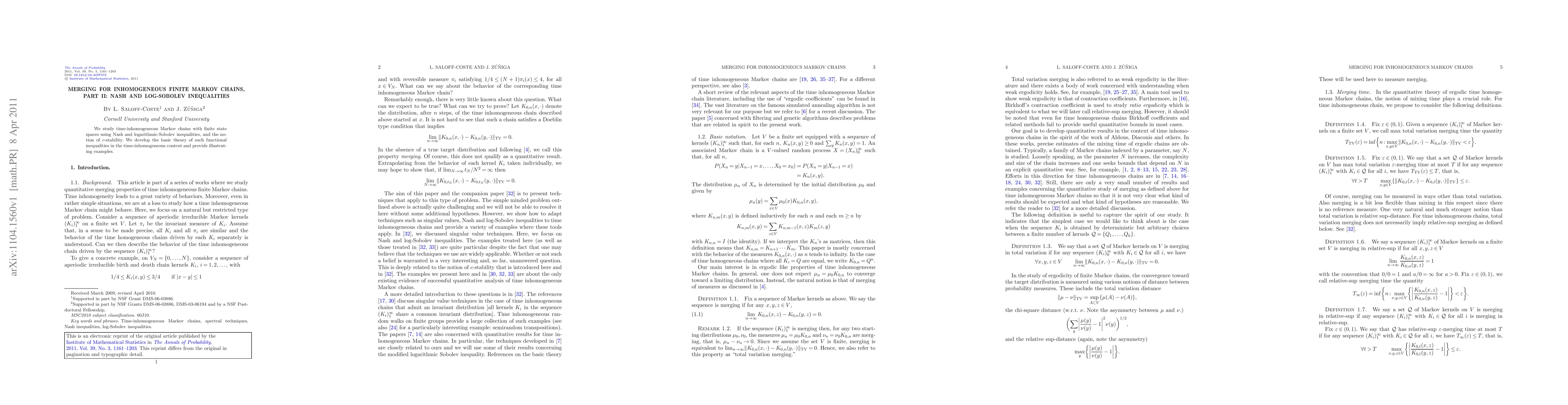 This paper develops the theory of Nash and log-Sobolev inequalities for time-inhomogeneous finite Markov chains, introducing the concept of $c$-stability and providing illustrative examples to demonstrate these functional inequalities.