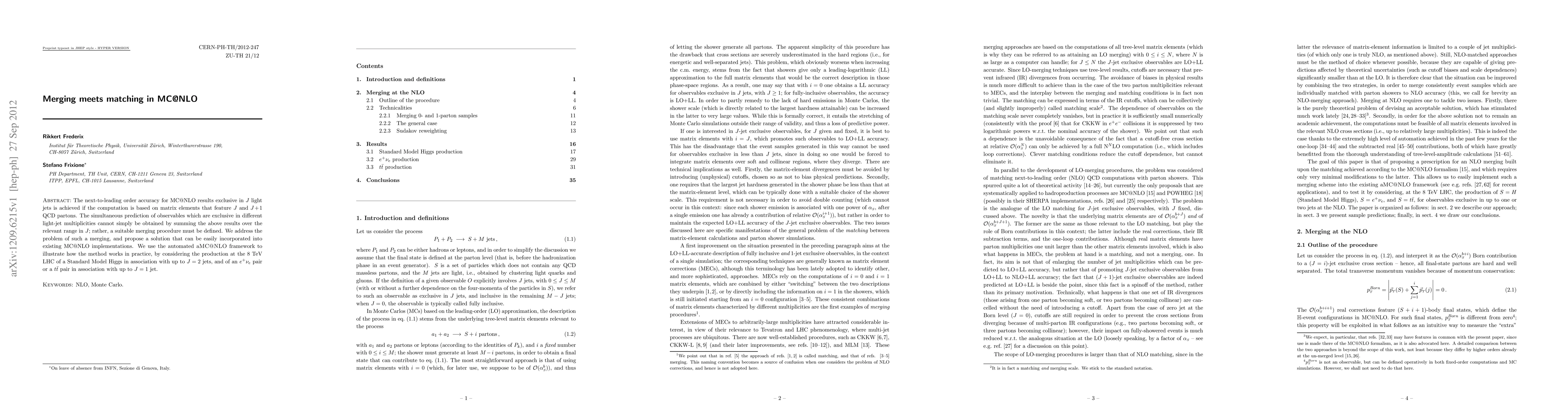 The next-to-leading order accuracy for MC@NLO results exclusive in J light jets is achieved if the computation is based on matrix elements that feature J and J+1 QCD partons. The simultaneous prediction of observables which are exclusive in different light-jet multiplicities cannot simply be obtained by summing the above results over the relevant range in J; rather, a suitable merging procedure must be defined. We address the problem of such a merging, and propose a solution that can be easily incorporated into existing MC@NLO implementations. We use the automated aMC@NLO framework to illustrate how the method works in practice, by considering the production at the 8 TeV LHC of a Standard Model Higgs in association with up to J=2 jets, and of an e\nu_e pair or a t\bar{t} pair in association with up to J=1 jet.