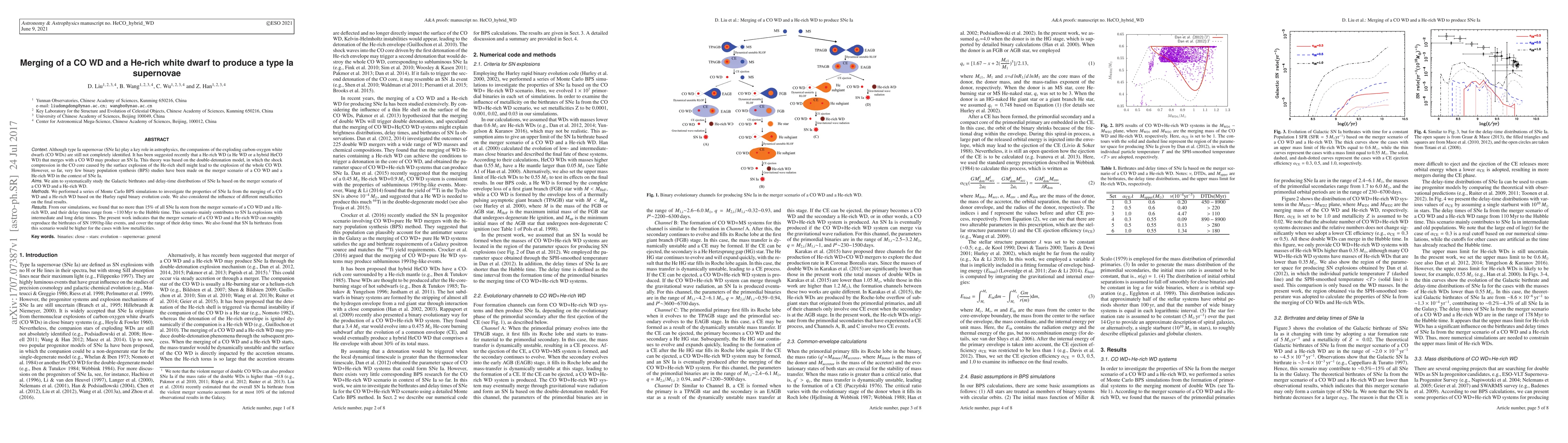 This study investigates the merger of a carbon-oxygen white dwarf (CO WD) with a helium-rich white dwarf (He-rich WD) as a potential progenitor for type Ia supernovae (SNe Ia), finding that this scenario accounts for no more than 15% of SNe Ia and contributes mainly to SNe Ia with intermediate and long delay times.