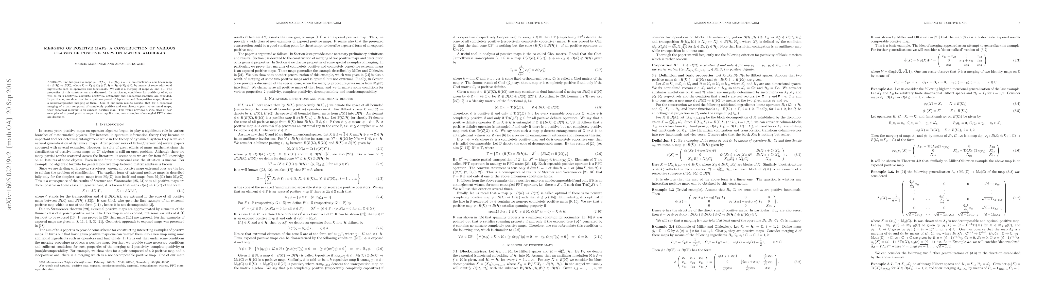 For two positive maps $\phi_i:B(\mathcal{K}_i)\to B(\mathcal{H}_i)$, $i=1,2$, we construct a new linear map $\phi:B(\mathcal{H})\to B(\mathcal{K})$, where $\mathcal{K}=\mathcal{K}_1\oplus\mathcal{K}_2\oplus\mathbb{C}$, $\mathcal{H}=\mathcal{H}_1\oplus\mathcal{H}_2\oplus\mathbb{C}$, by means of some additional ingredients such as operators and functionals. We call it a merging of maps $\phi_1$ and $\phi_2$. We discuss properties of this construction. In particular, we provide conditions for positivity of $\phi$, as well as for $2$-positivity, complete positivity and nondecomposability. In particular, we show that for a pair composed of $2$-positive and $2$-copositive maps, there is a nondecomposable merging of them. One of our main results asserts, that for a canonical merging of a pair composed of completely positive and completely copositive extremal maps, their canonical merging is an exposed positive map. This result provides a wide class of new examples of exposed positive maps. As an application, new examples of entangled PPT states are described.