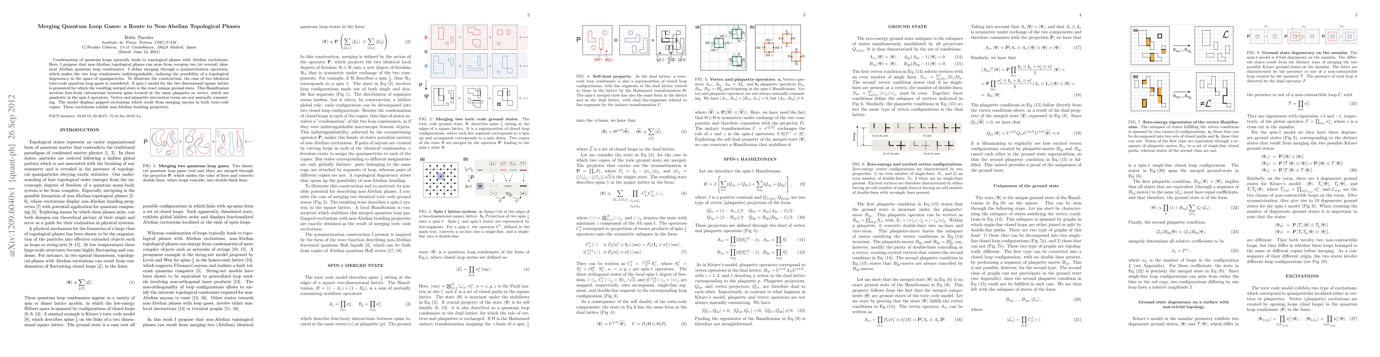 Condensation of quantum loops naturally leads to topological phases with Abelian excitations. Here, I propose that non-Abelian topological phases can arise from merging two (or several) identical Abelian quantum loop condensates. I define merging through a symmetrization operation, which makes the two loop condensates indistinguishable, inducing the possibility of a topological degeneracy in the space of quasiparticles. To illustrate the construction, the case of two identical toric-code quantum loop gases is considered. A spin-1 model for the two dimensional square lattice is presented for which the resulting merged state is the exact unique ground state. This Hamiltonian involves four-body interactions between spins located at the same plaquette or vertex, which are quadratic in the spin-1 operators. Vertex and plaquette interaction terms are not mutually commuting. The model displays gapped excitations which result from merging anyons in both toric-code copies. These excitations exhibit non-Abelian braiding properties.