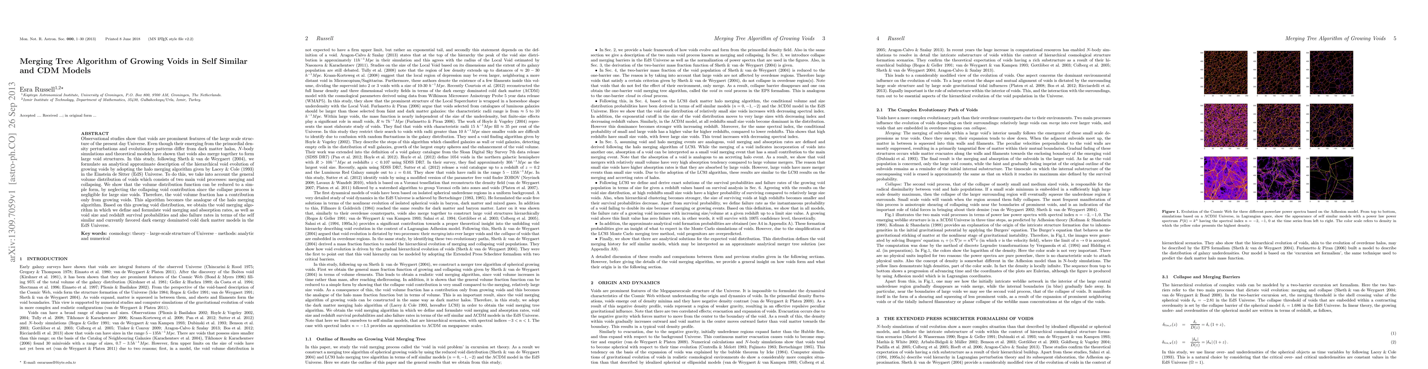 This study develops an analytical model for the merging of voids in the universe, using a modified version of the halo-merging algorithm, to understand how large-scale structures form and evolve.